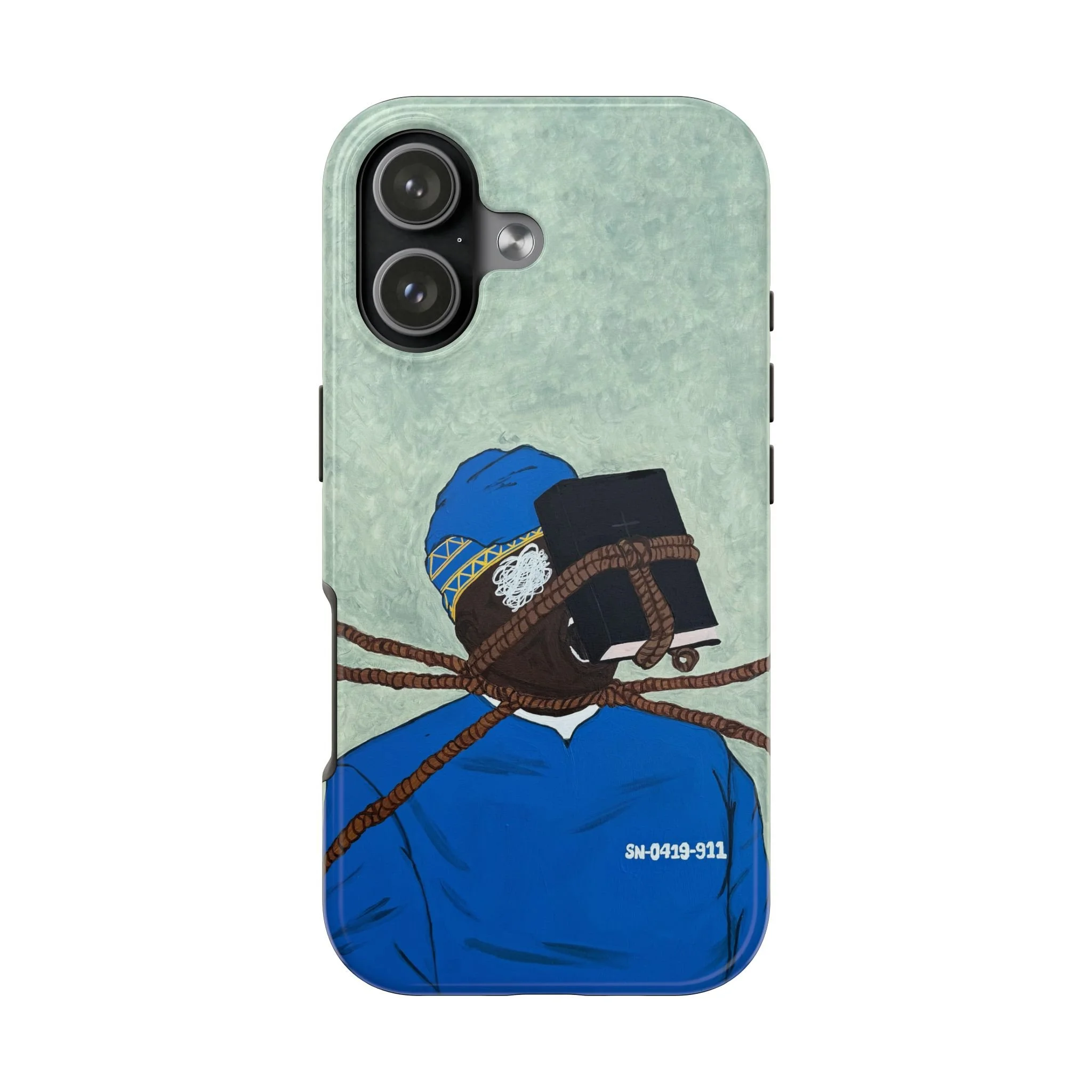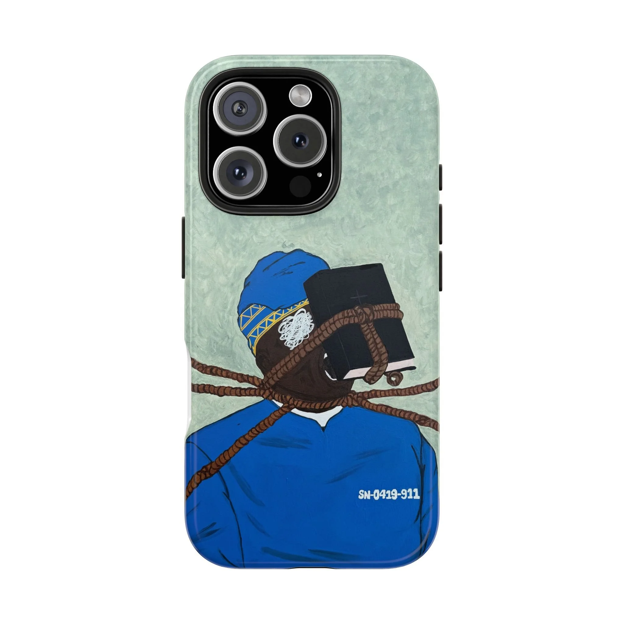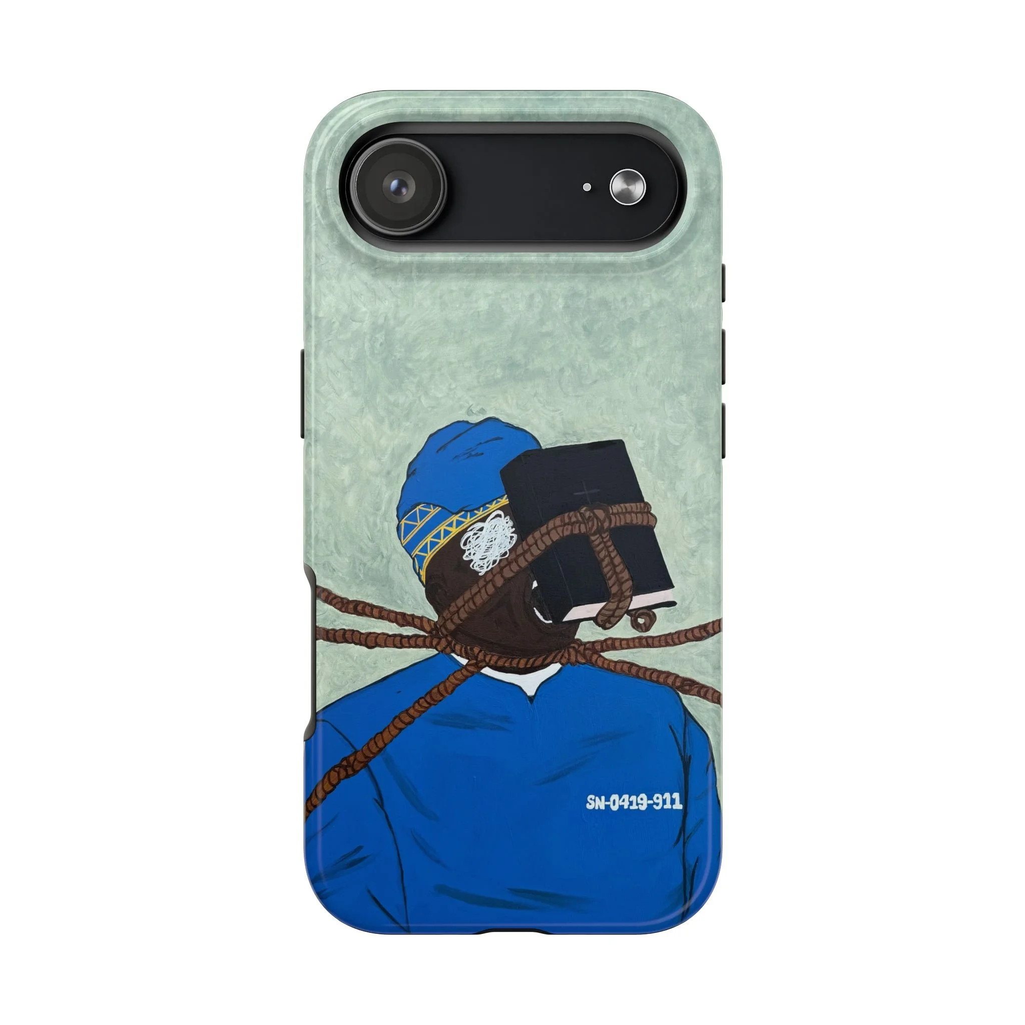 This phone case carries a quiet, thoughtful edge — a figure in blue with their eyes obscured by a wrapped box, ropes crossing the scene like a map of constraints and resilience. The muted, textured background and glossy finish give the artwork depth while the flexible rubber liner and two-piece polycarbonate shell stand ready for everyday knocks. It’s the kind of case that reads like a statement: protective, art-forward, and a little mysterious. Slip it on and your phone gains both long-lasting weather resistance and personality that starts conversations.