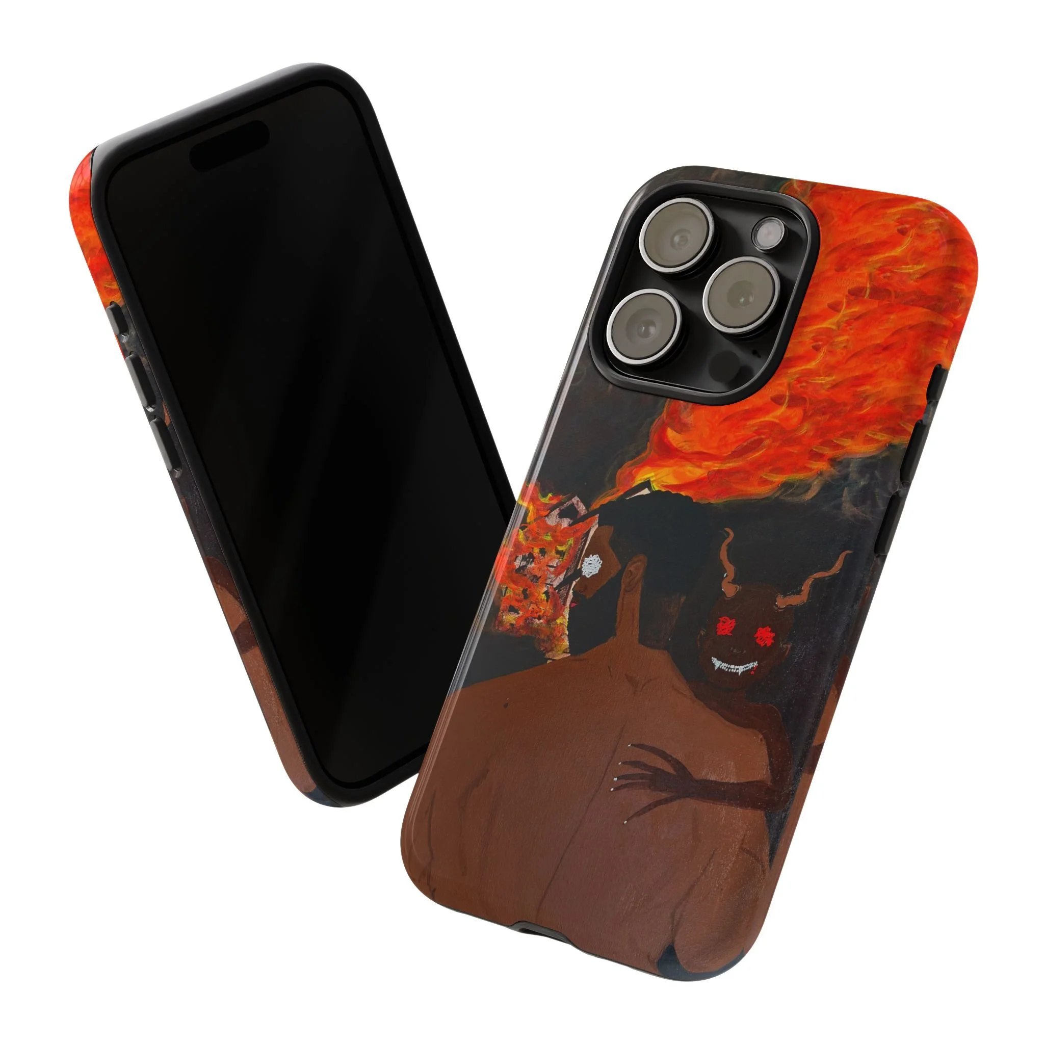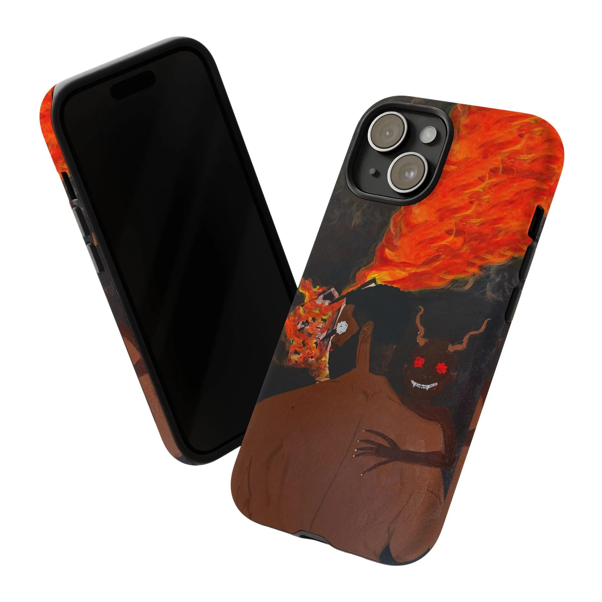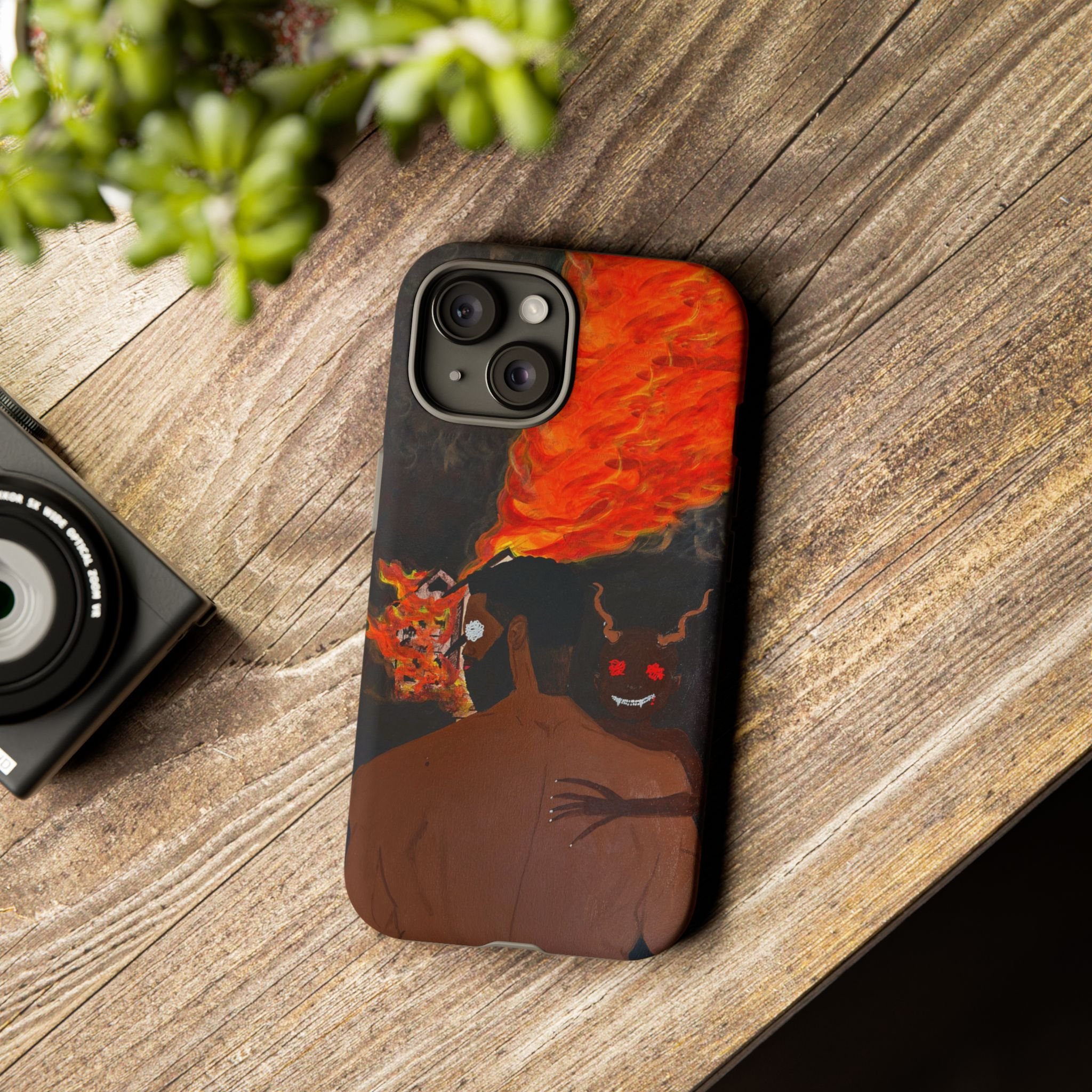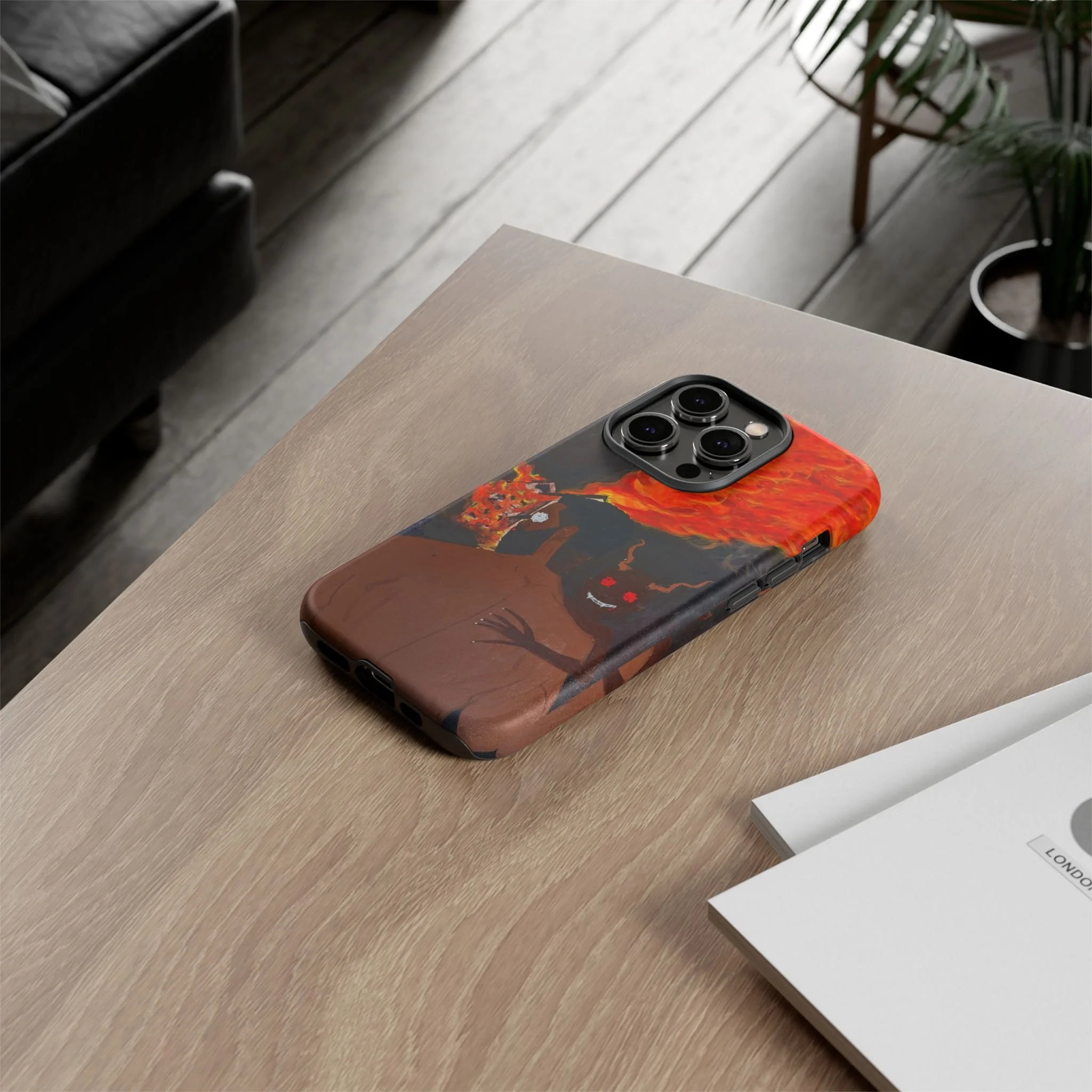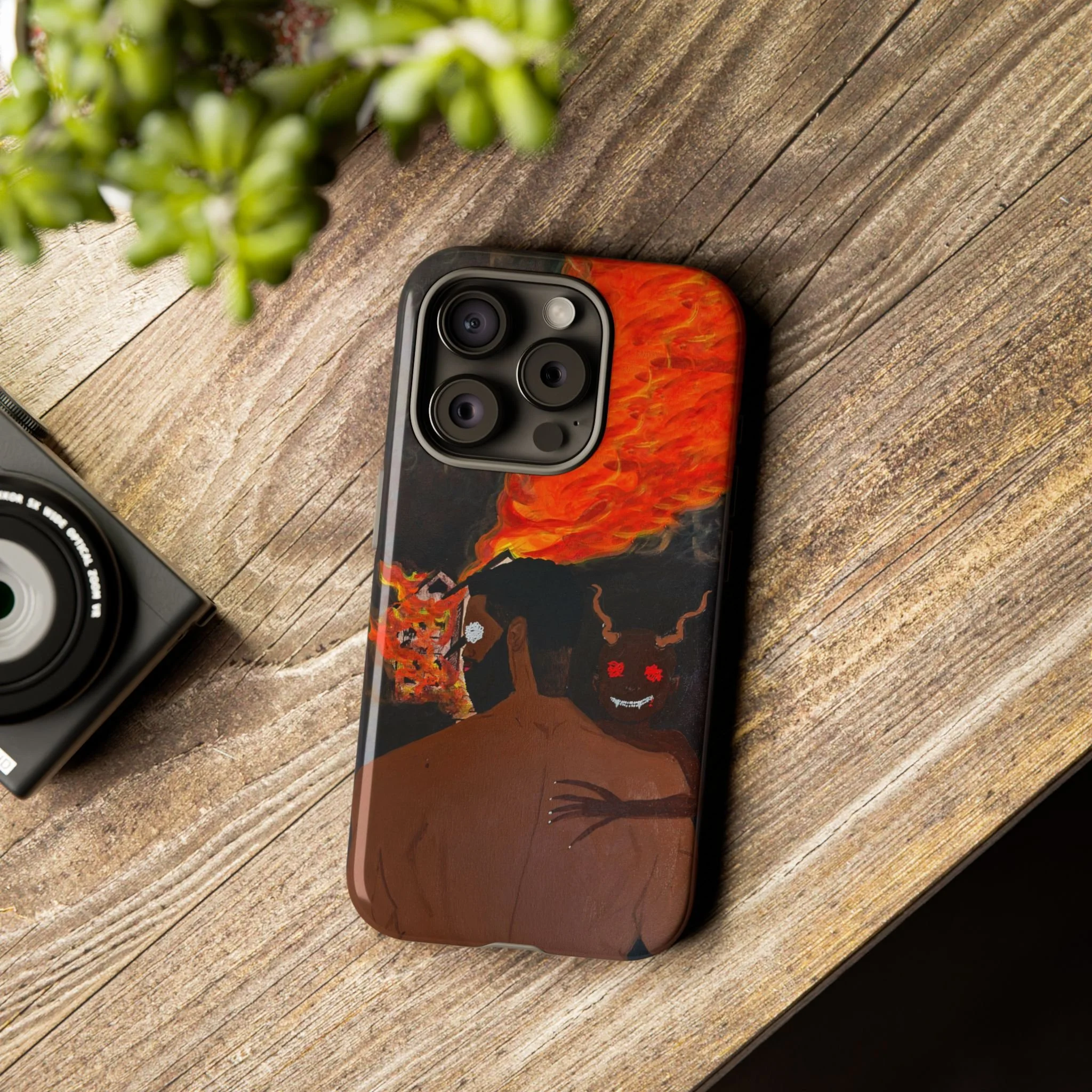 This tough phone case carries attitude — a dark, hand-painted scene with flickering flames and a shadowy figure that feels part myth, part urban legend. The dual-layer shell and soft TPU liner work together to absorb shocks and guard your device while the full-wrap print keeps the artwork vivid across the edges. It wears well on daily commutes and late-night walks, adding a raw, expressive edge to a pocket or bag. Built to handle drops and everyday knocks, it also resists outdoor fading thanks to UV protection. Keep it dry and away from heavy alcohol-based products to preserve the finish, and you'll have striking protection that keeps its story intact.