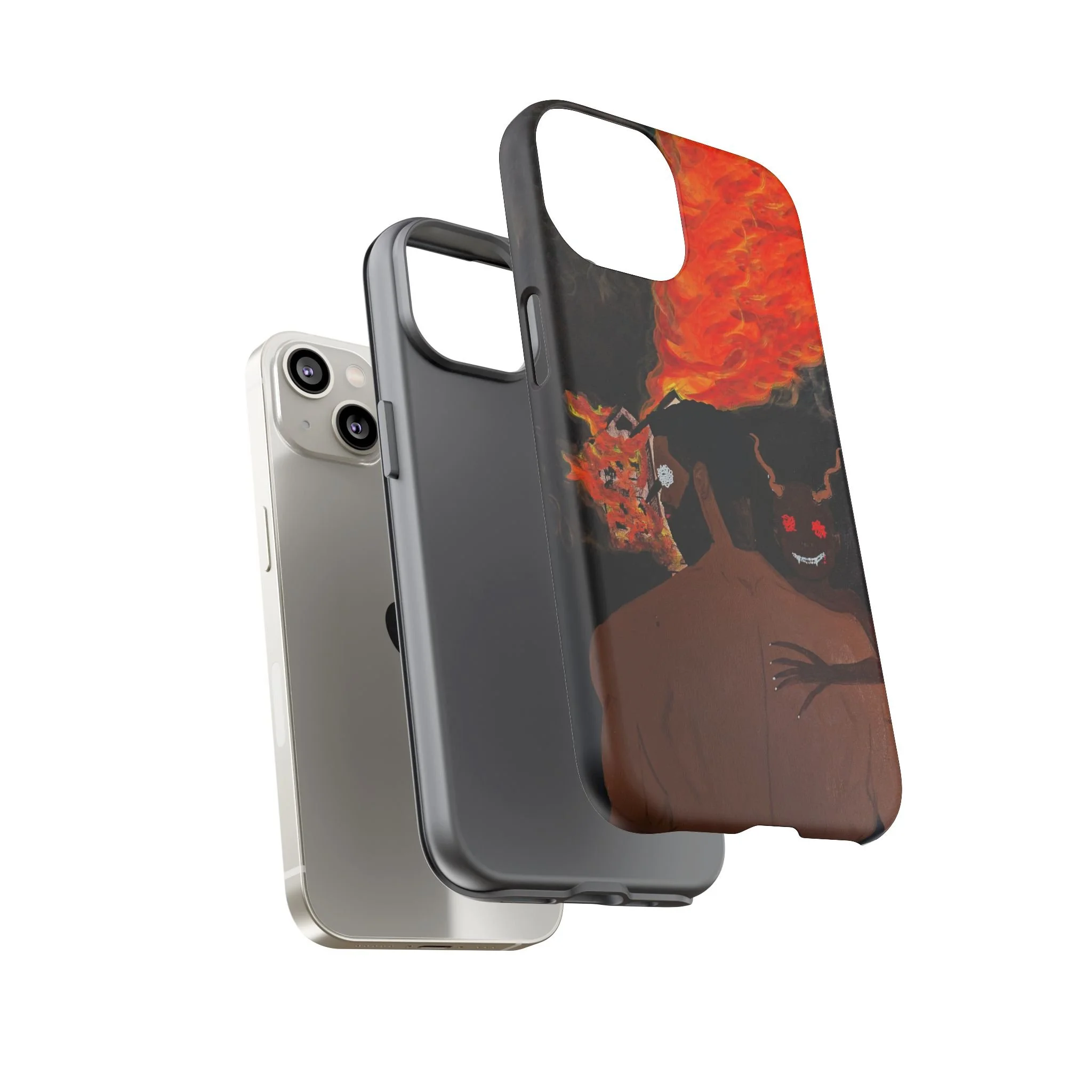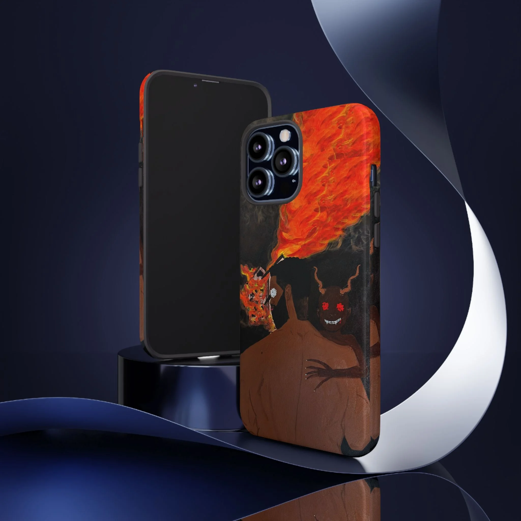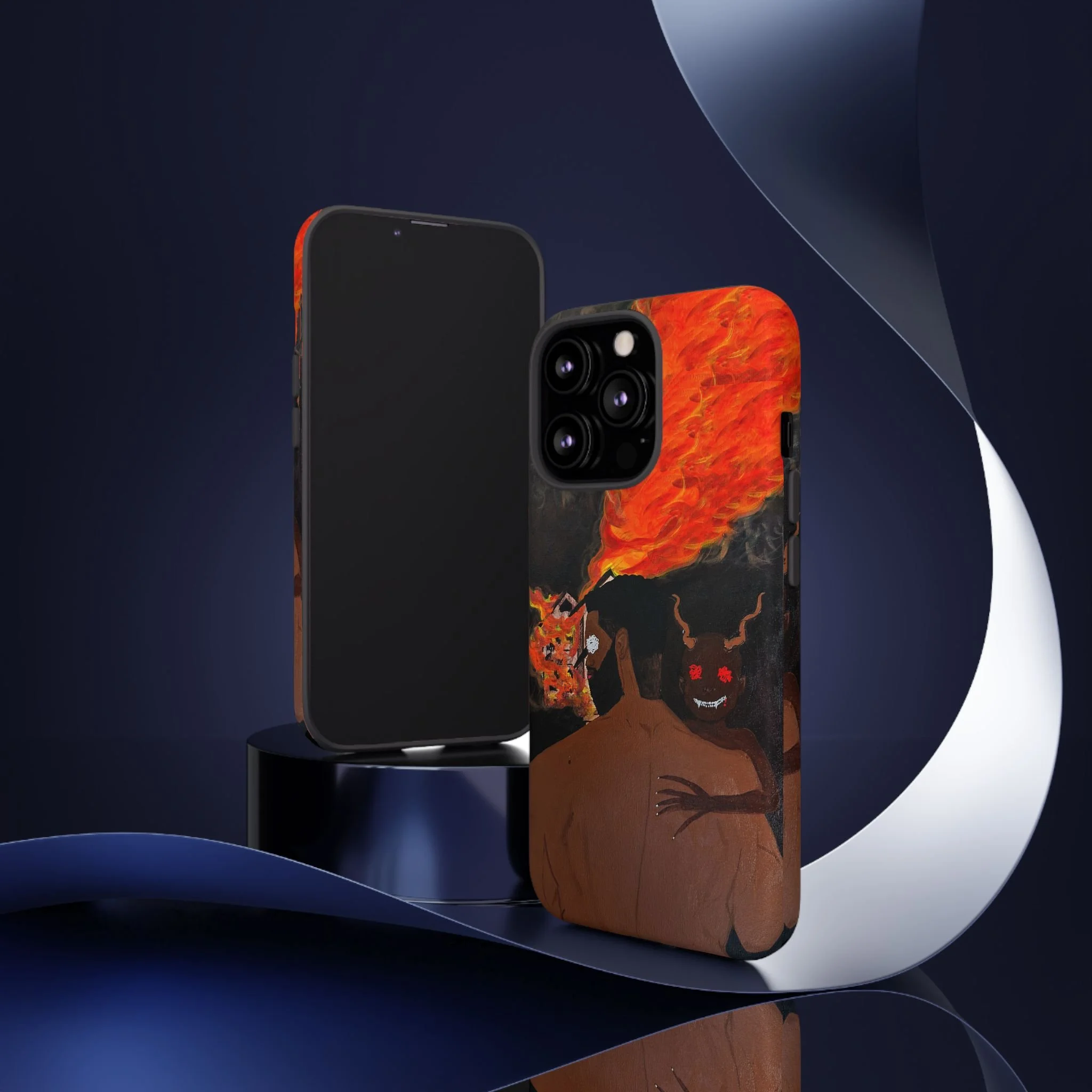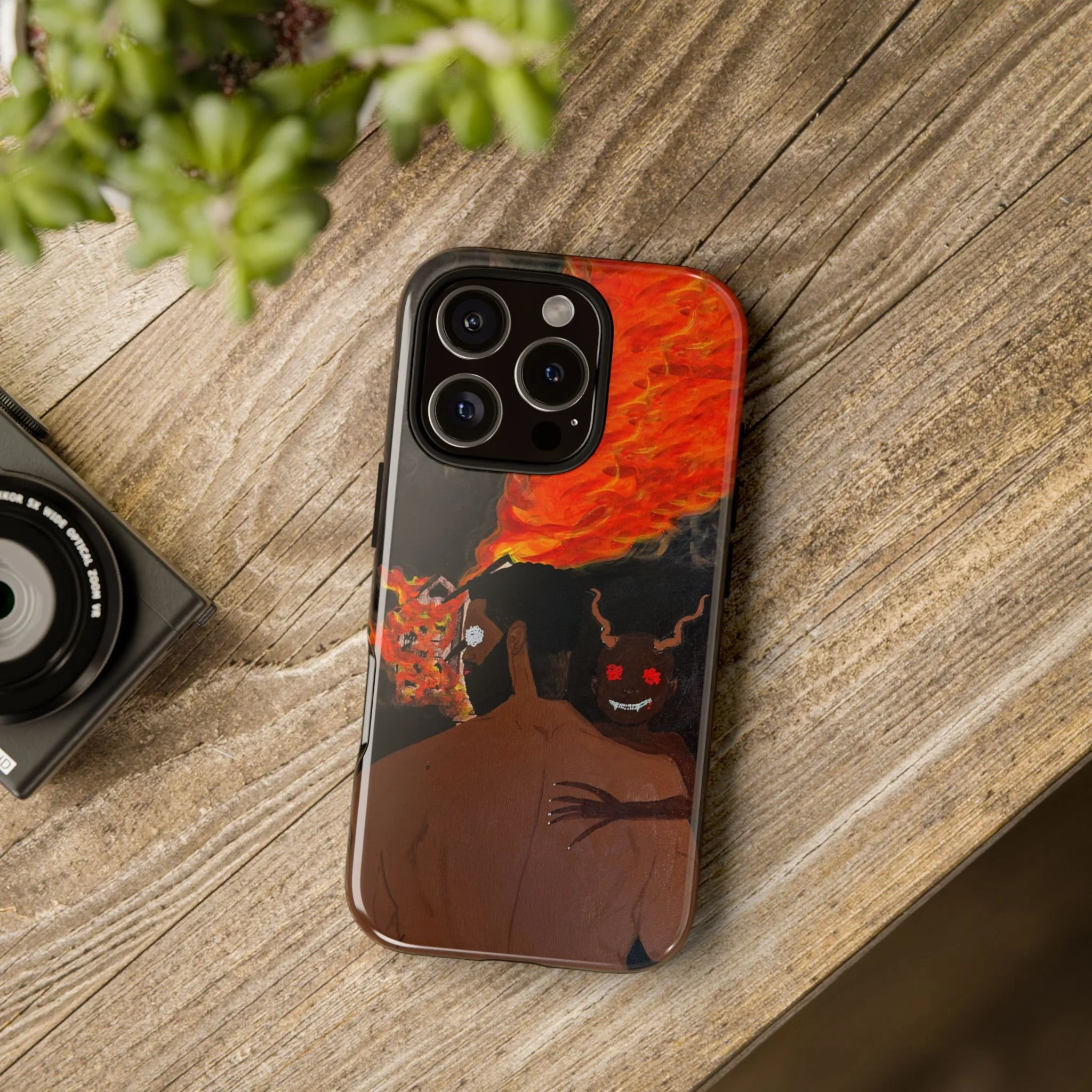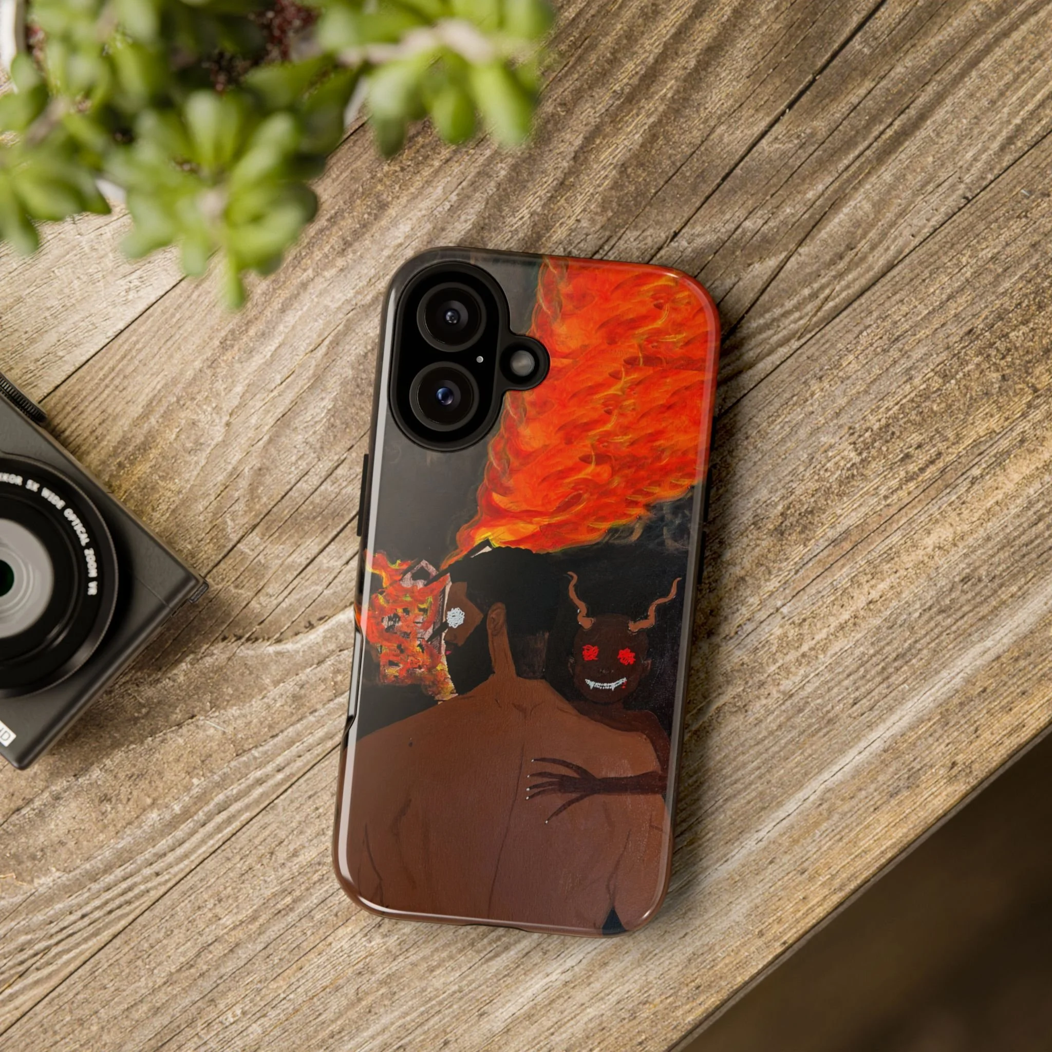 This tough phone case carries attitude — a dark, hand-painted scene with flickering flames and a shadowy figure that feels part myth, part urban legend. The dual-layer shell and soft TPU liner work together to absorb shocks and guard your device while the full-wrap print keeps the artwork vivid across the edges. It wears well on daily commutes and late-night walks, adding a raw, expressive edge to a pocket or bag. Built to handle drops and everyday knocks, it also resists outdoor fading thanks to UV protection. Keep it dry and away from heavy alcohol-based products to preserve the finish, and you'll have striking protection that keeps its story intact.