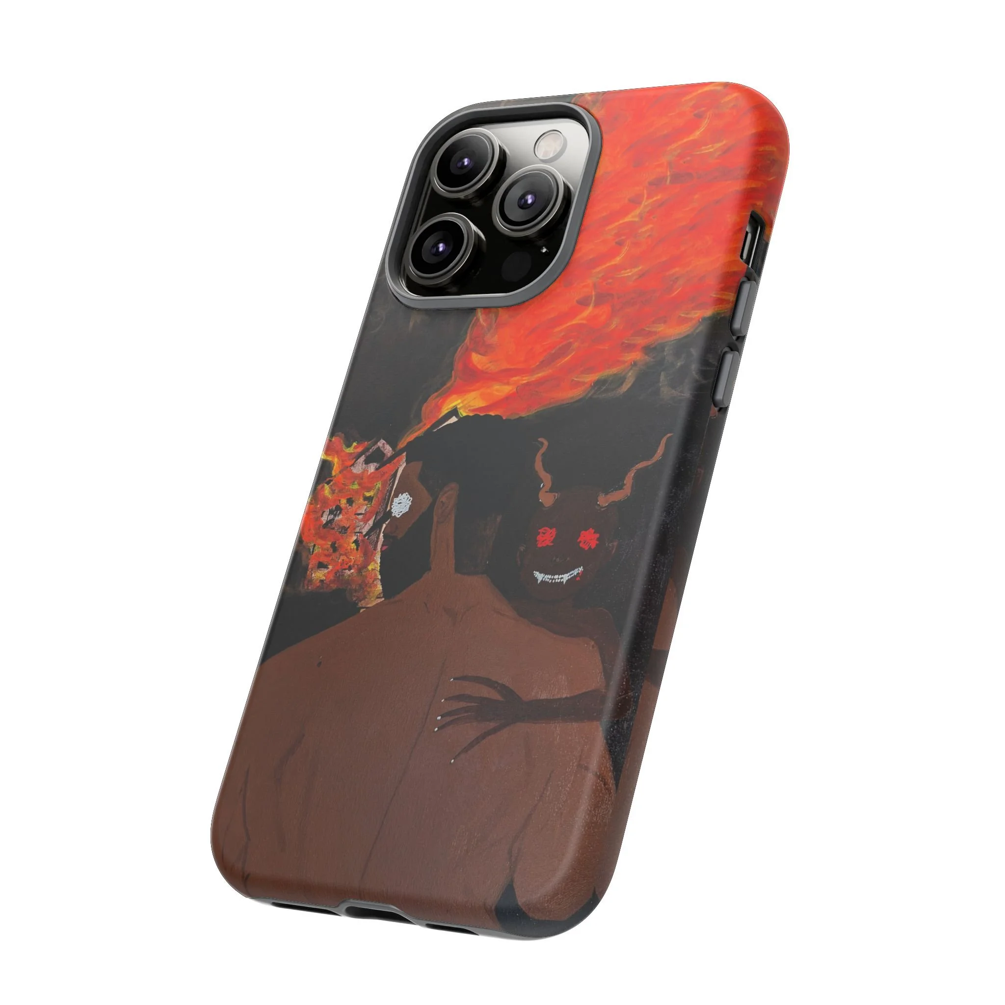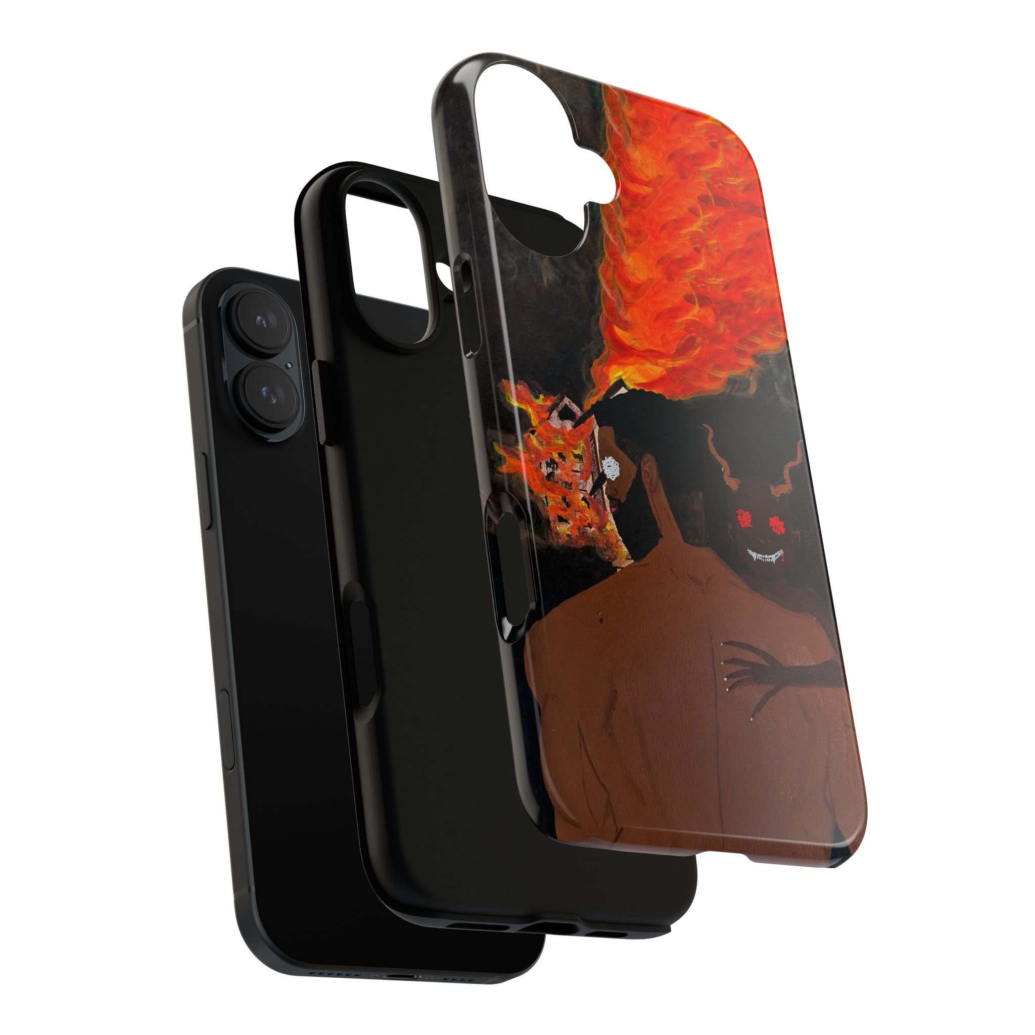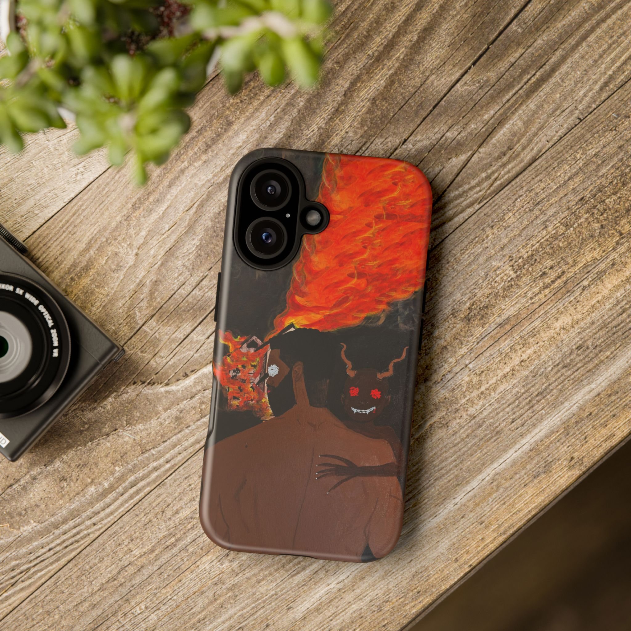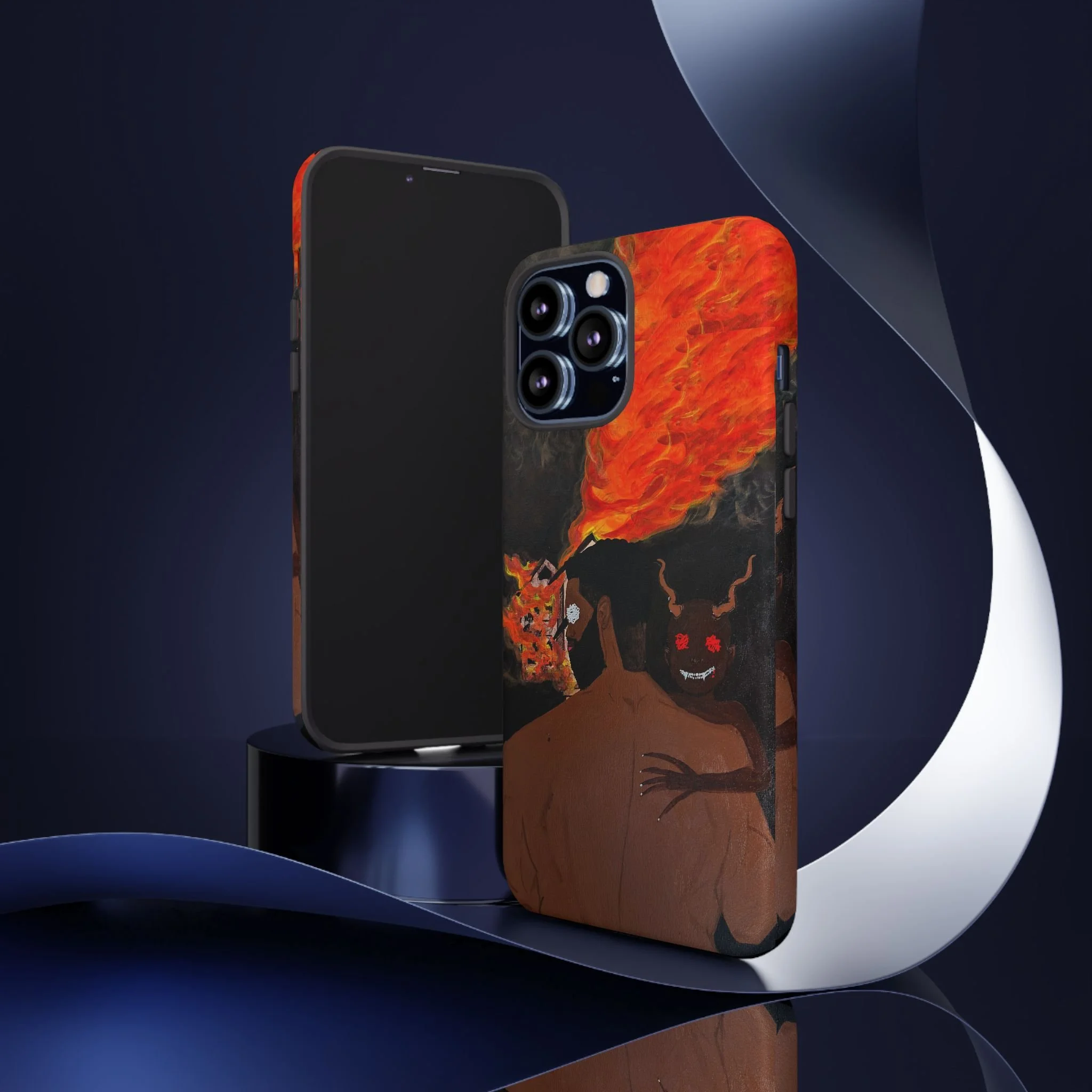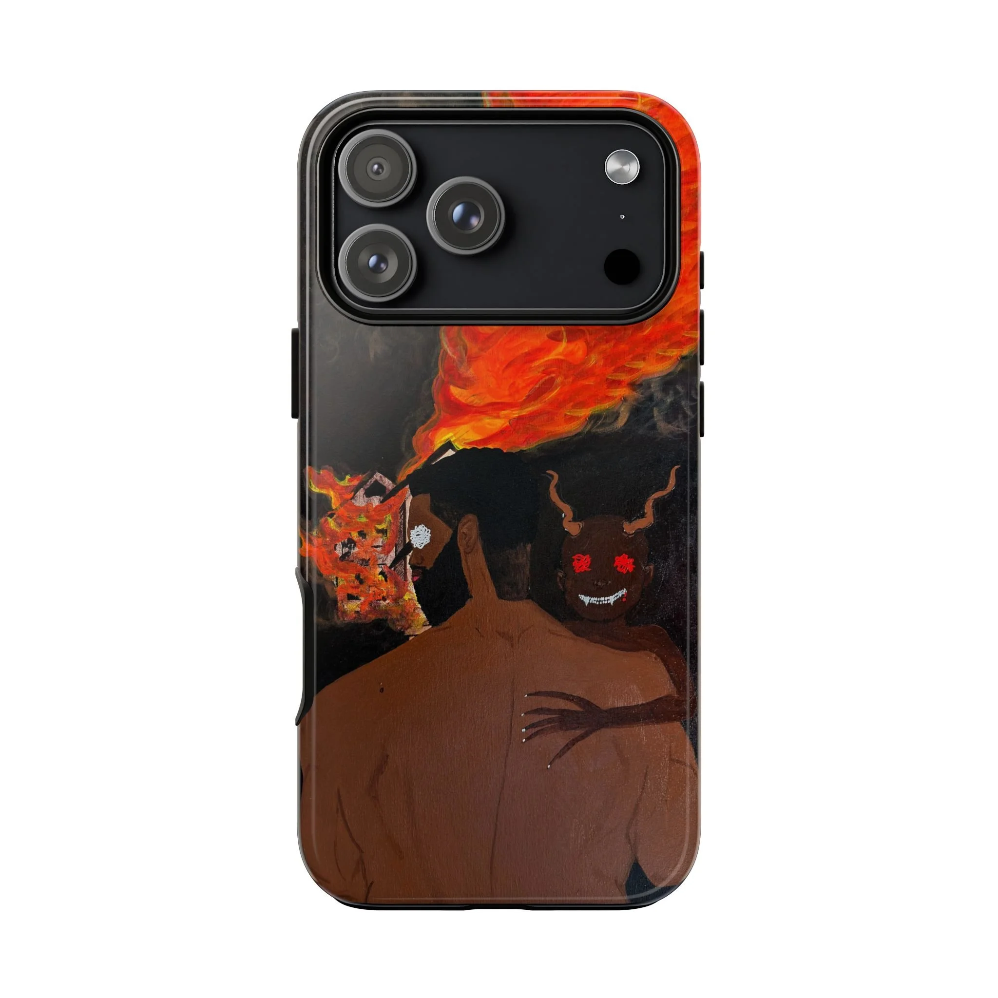 This tough phone case carries attitude — a dark, hand-painted scene with flickering flames and a shadowy figure that feels part myth, part urban legend. The dual-layer shell and soft TPU liner work together to absorb shocks and guard your device while the full-wrap print keeps the artwork vivid across the edges. It wears well on daily commutes and late-night walks, adding a raw, expressive edge to a pocket or bag. Built to handle drops and everyday knocks, it also resists outdoor fading thanks to UV protection. Keep it dry and away from heavy alcohol-based products to preserve the finish, and you'll have striking protection that keeps its story intact.