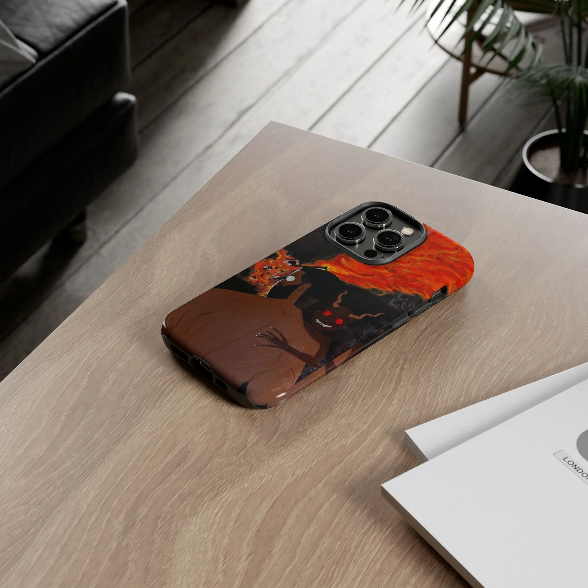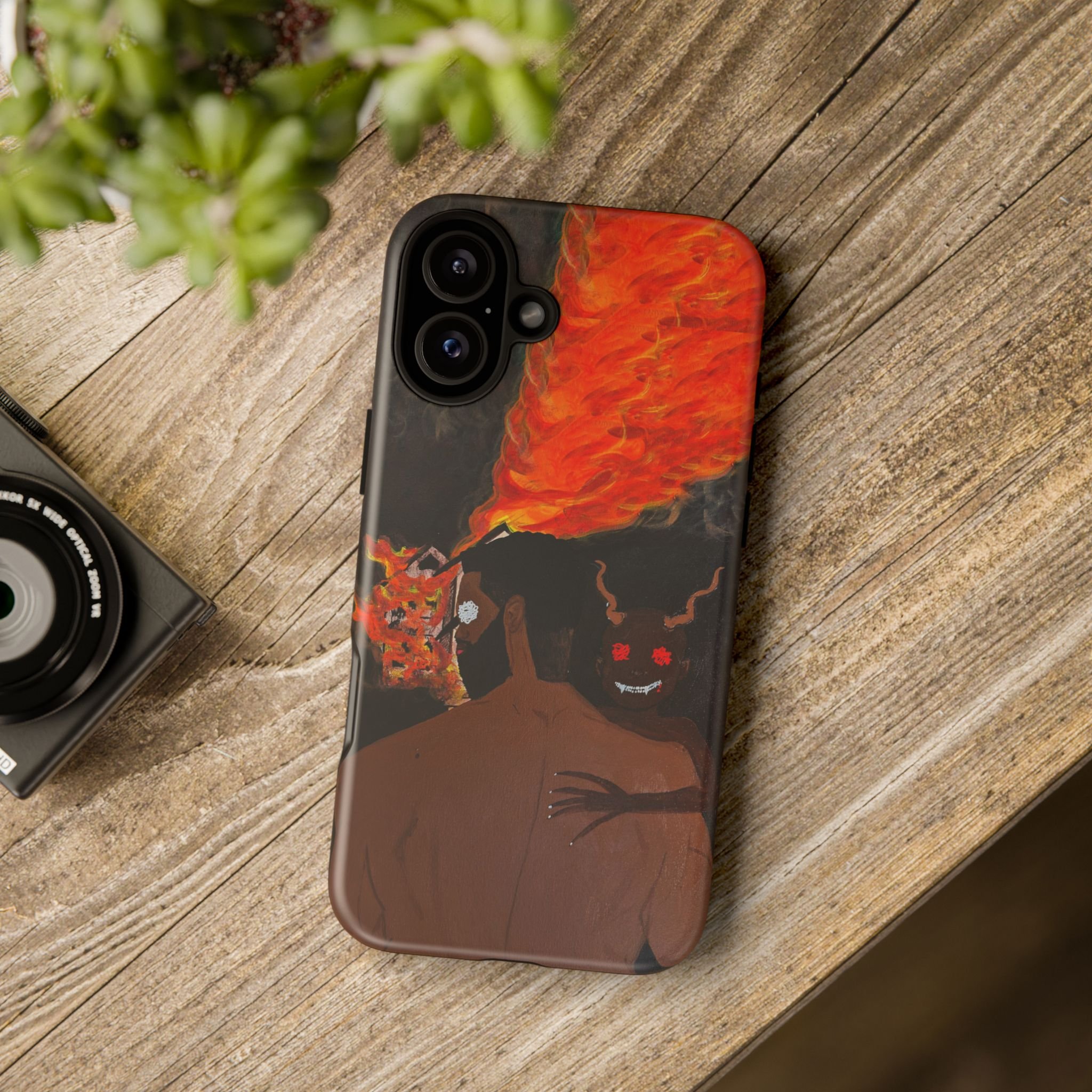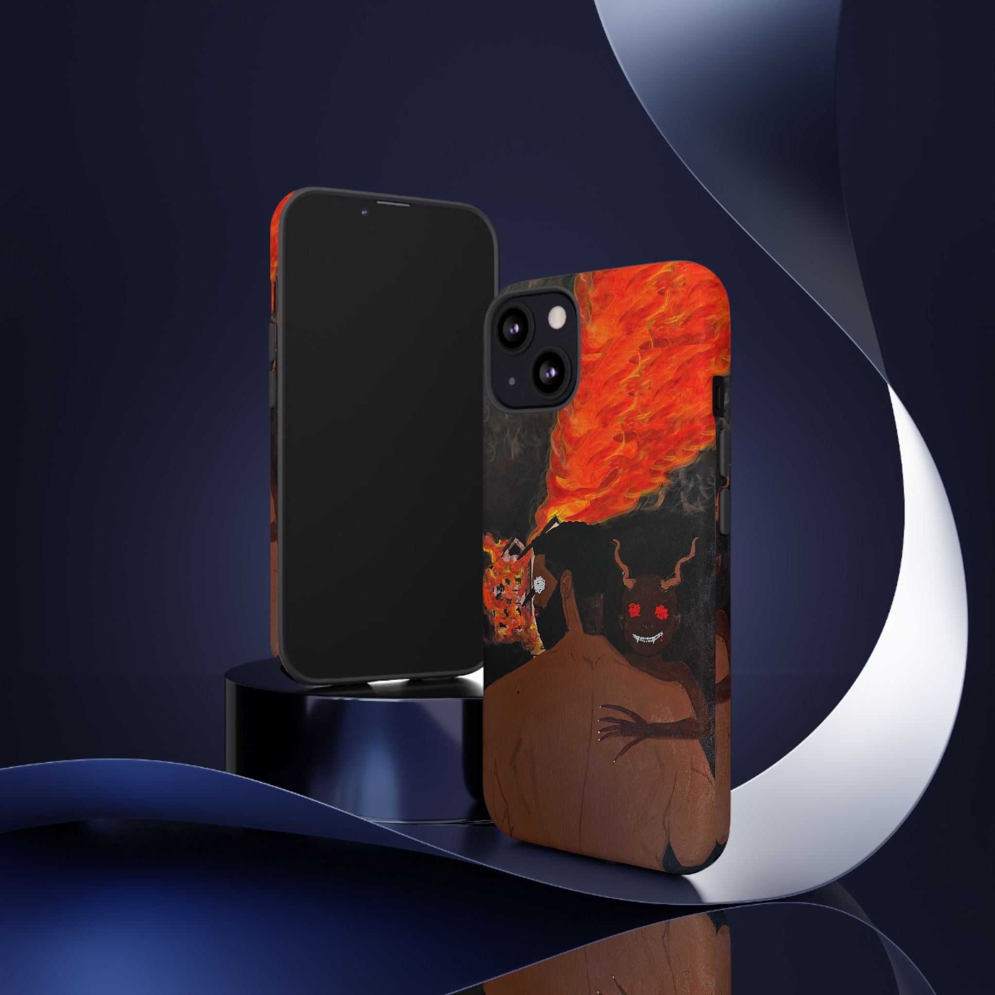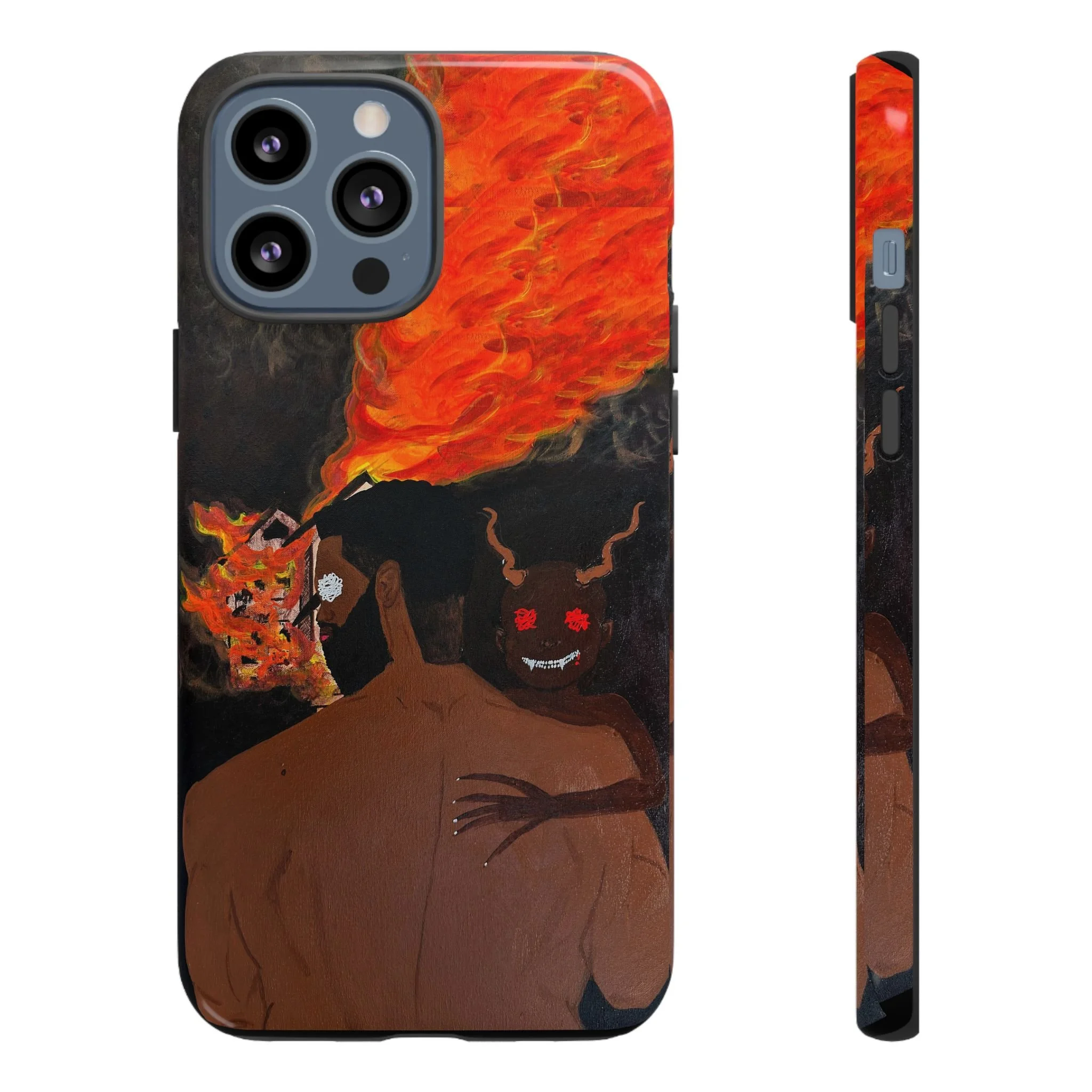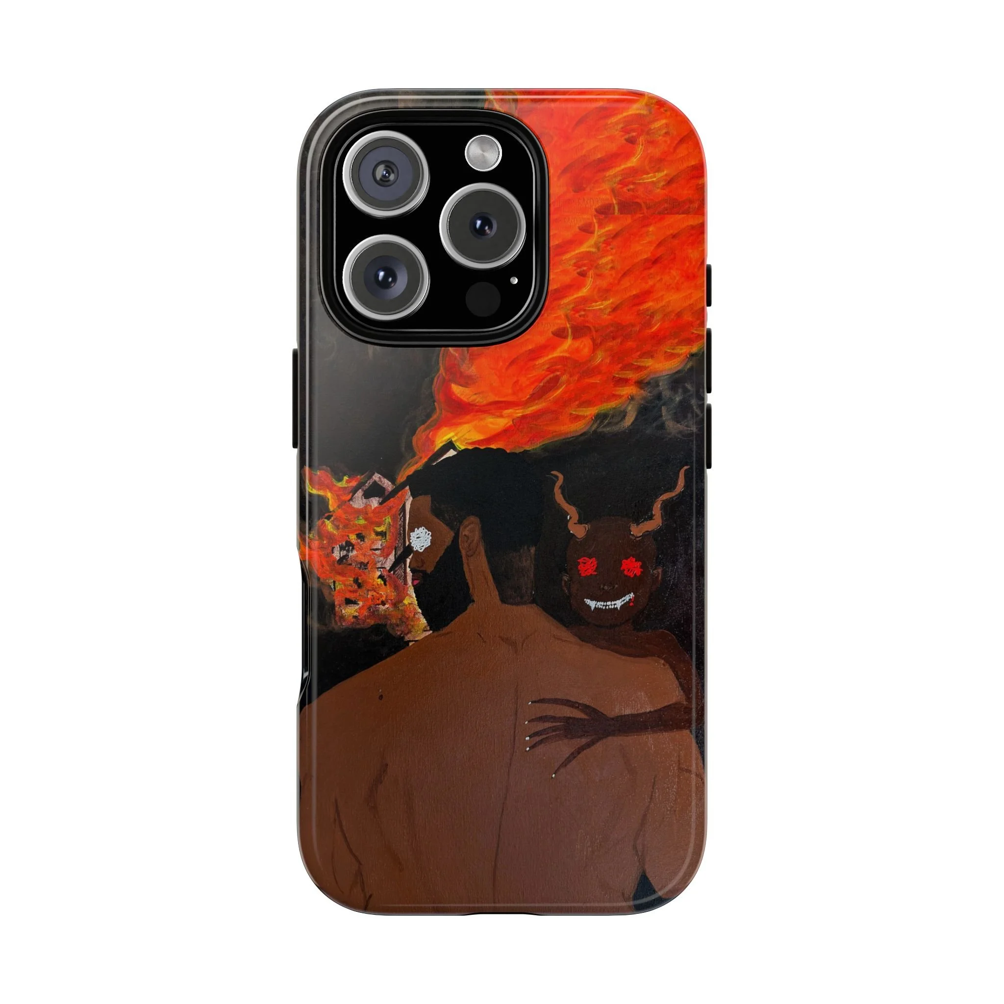 This tough phone case carries attitude — a dark, hand-painted scene with flickering flames and a shadowy figure that feels part myth, part urban legend. The dual-layer shell and soft TPU liner work together to absorb shocks and guard your device while the full-wrap print keeps the artwork vivid across the edges. It wears well on daily commutes and late-night walks, adding a raw, expressive edge to a pocket or bag. Built to handle drops and everyday knocks, it also resists outdoor fading thanks to UV protection. Keep it dry and away from heavy alcohol-based products to preserve the finish, and you'll have striking protection that keeps its story intact.