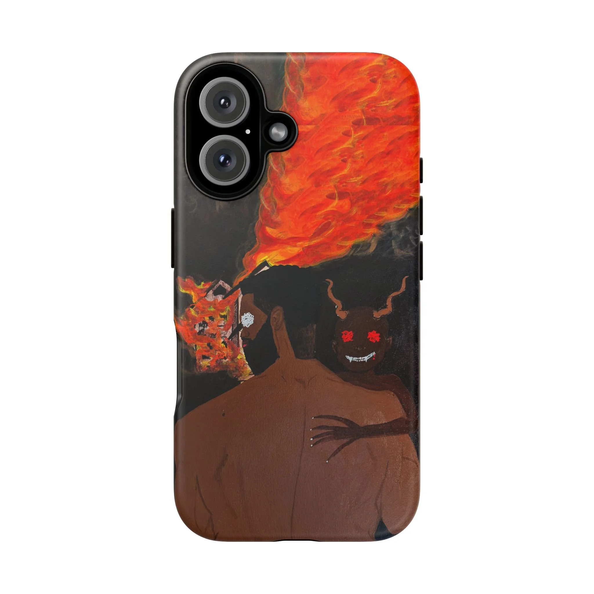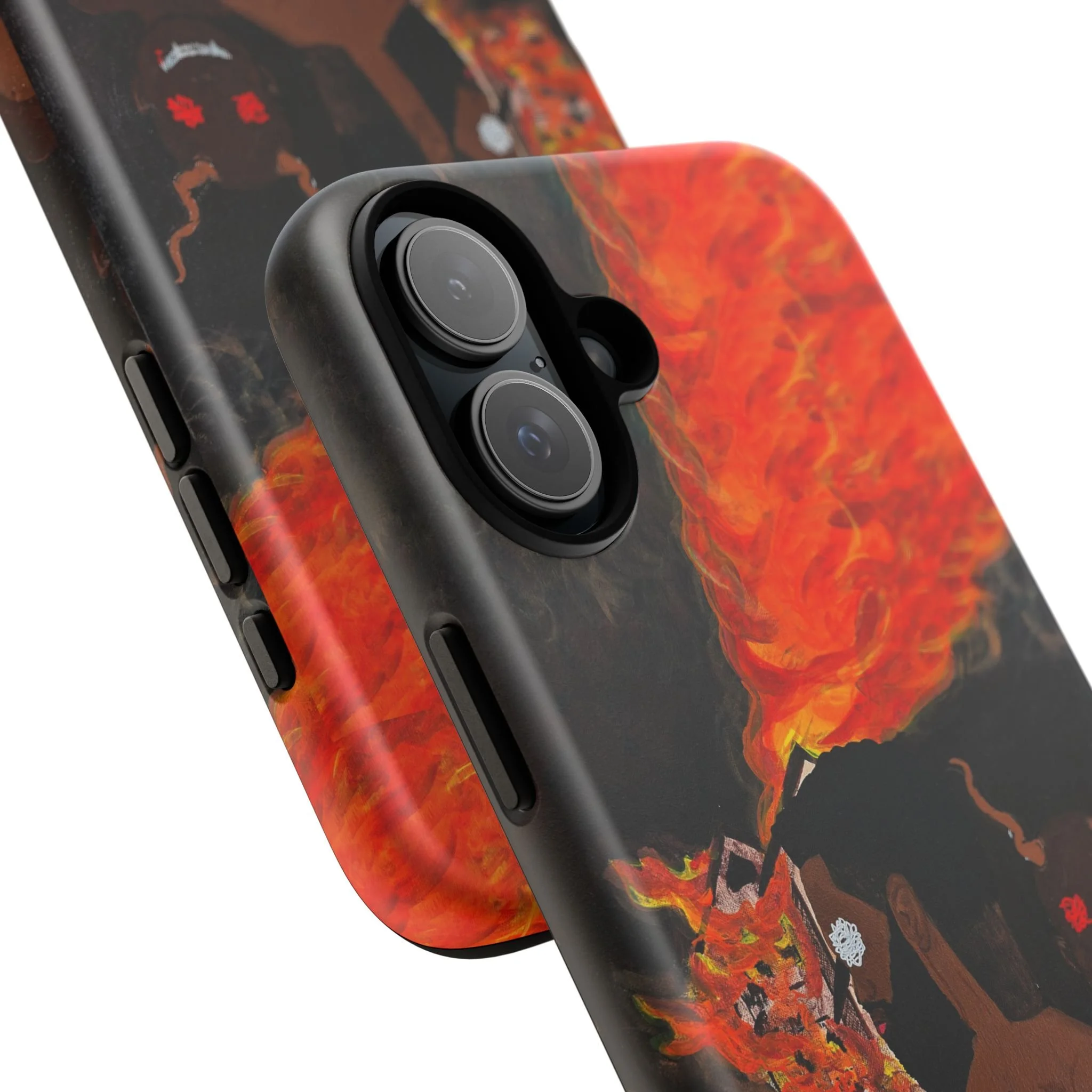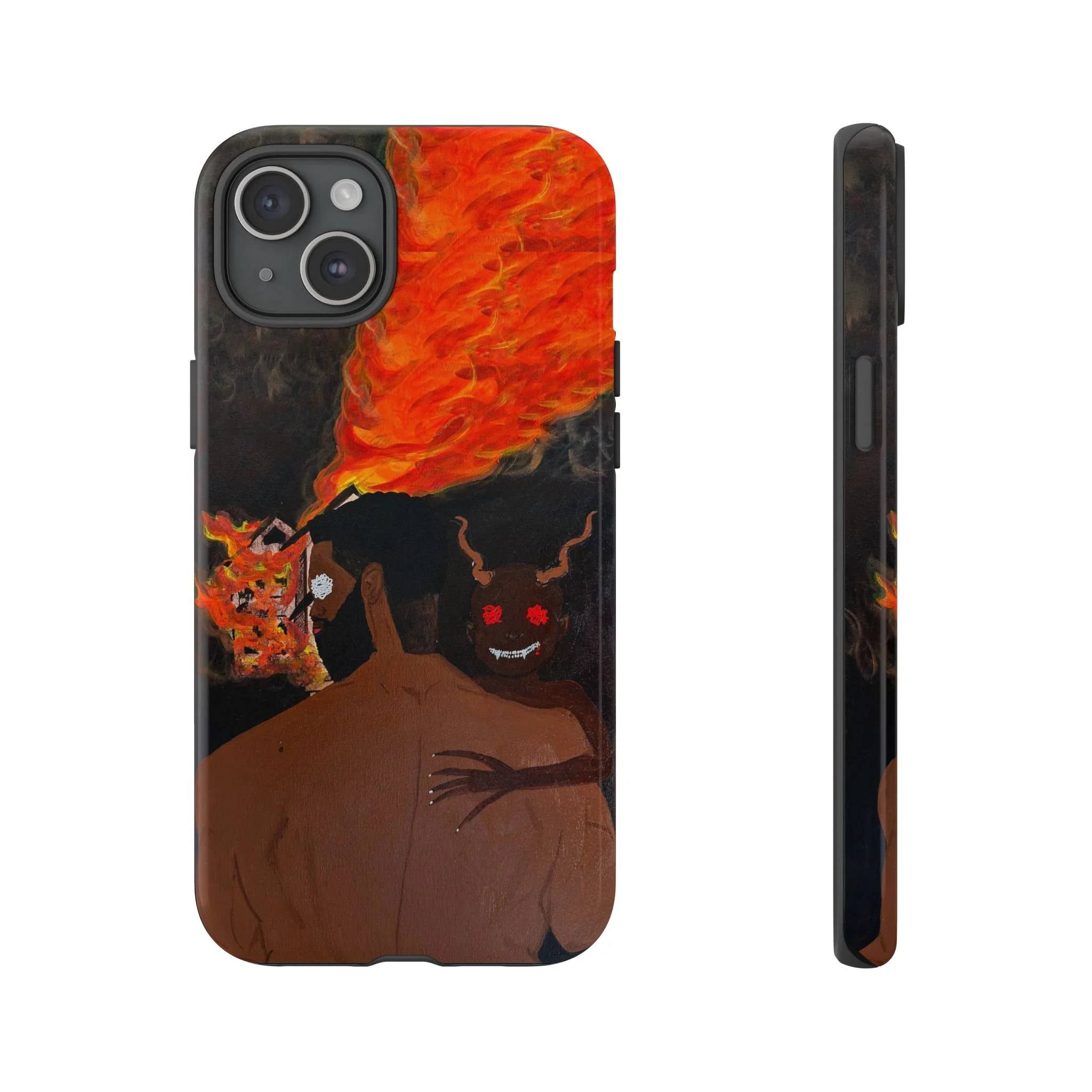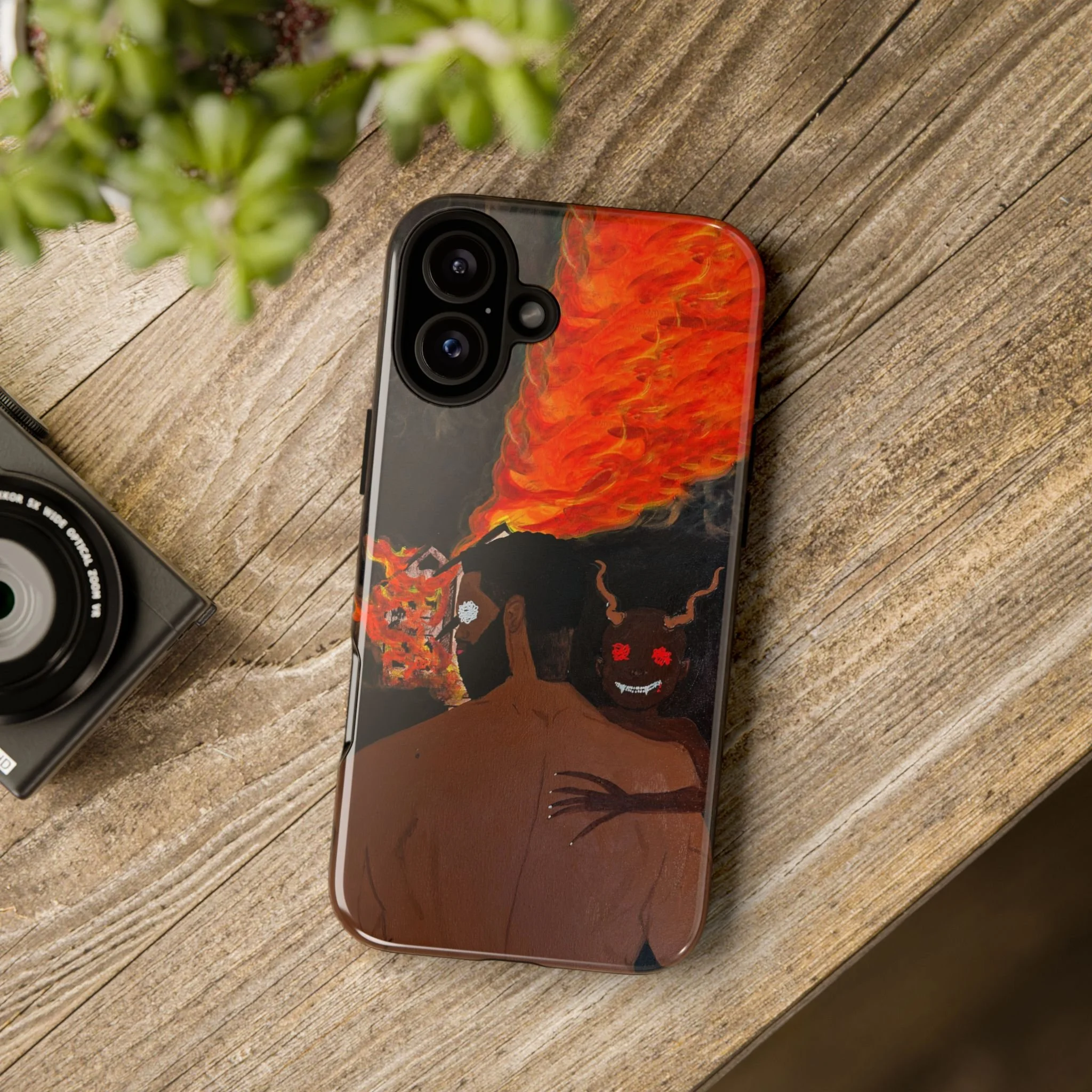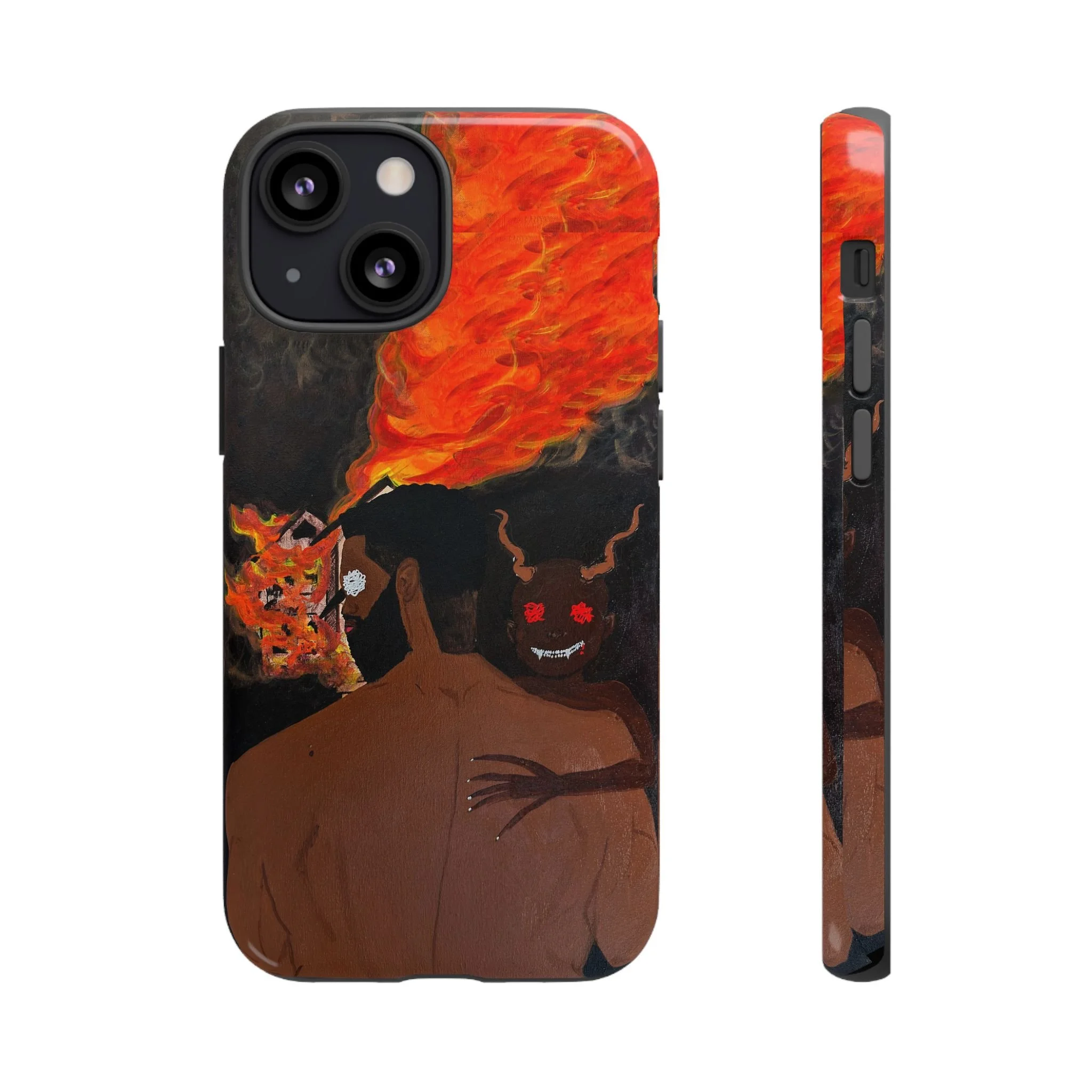 This tough phone case carries attitude — a dark, hand-painted scene with flickering flames and a shadowy figure that feels part myth, part urban legend. The dual-layer shell and soft TPU liner work together to absorb shocks and guard your device while the full-wrap print keeps the artwork vivid across the edges. It wears well on daily commutes and late-night walks, adding a raw, expressive edge to a pocket or bag. Built to handle drops and everyday knocks, it also resists outdoor fading thanks to UV protection. Keep it dry and away from heavy alcohol-based products to preserve the finish, and you'll have striking protection that keeps its story intact.