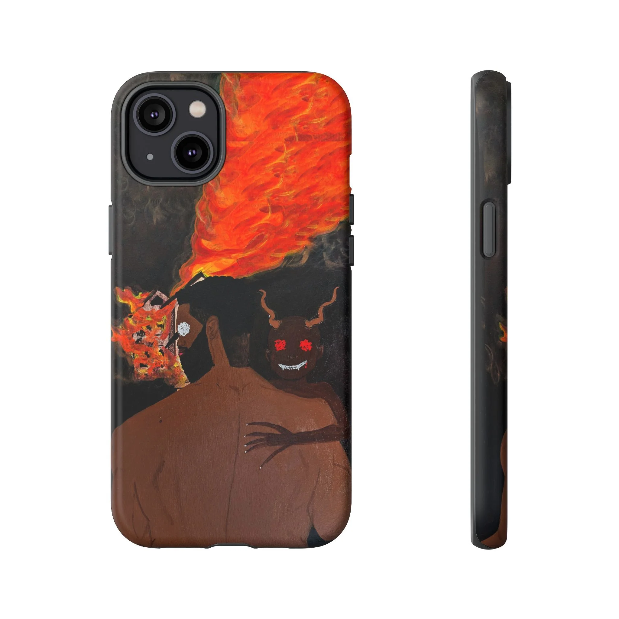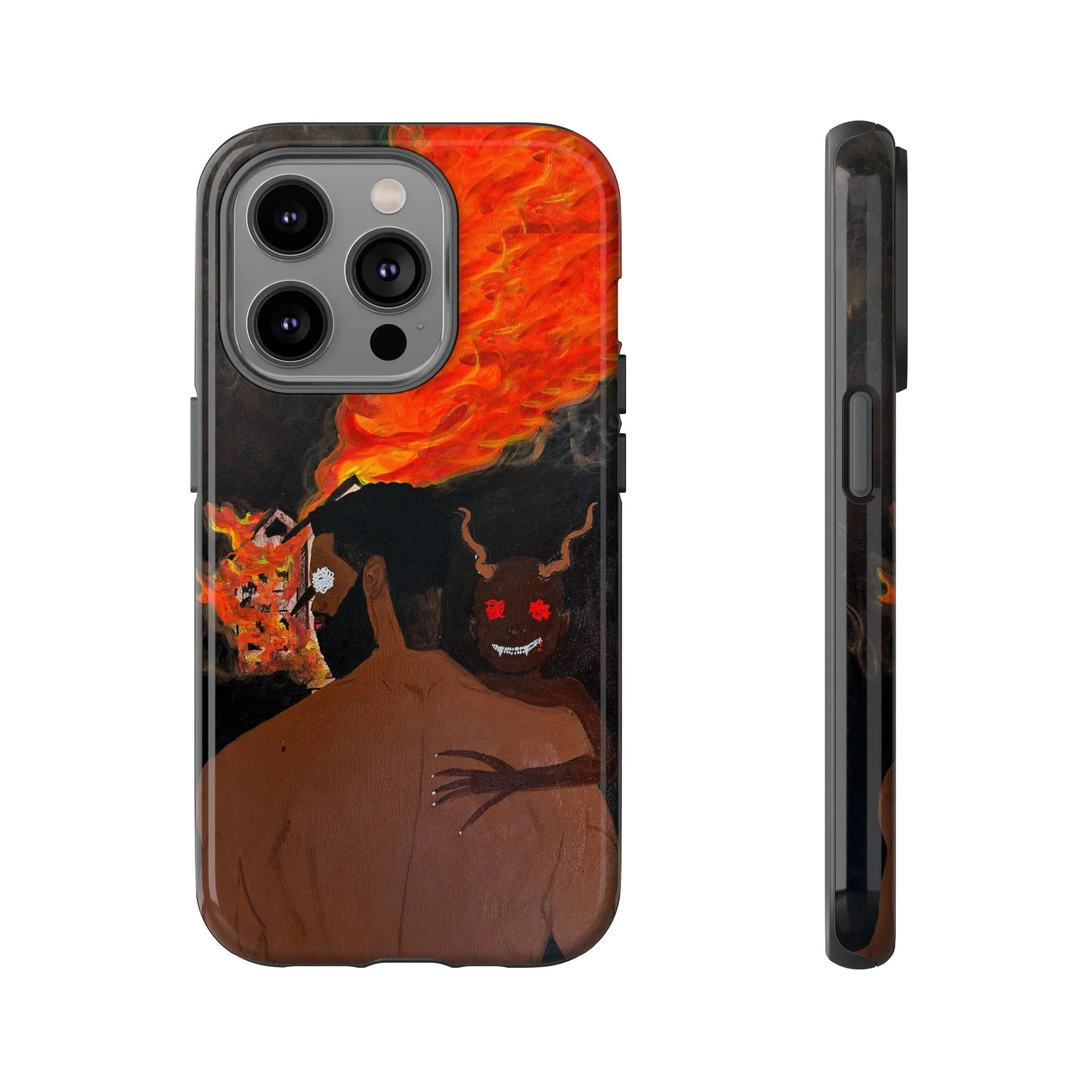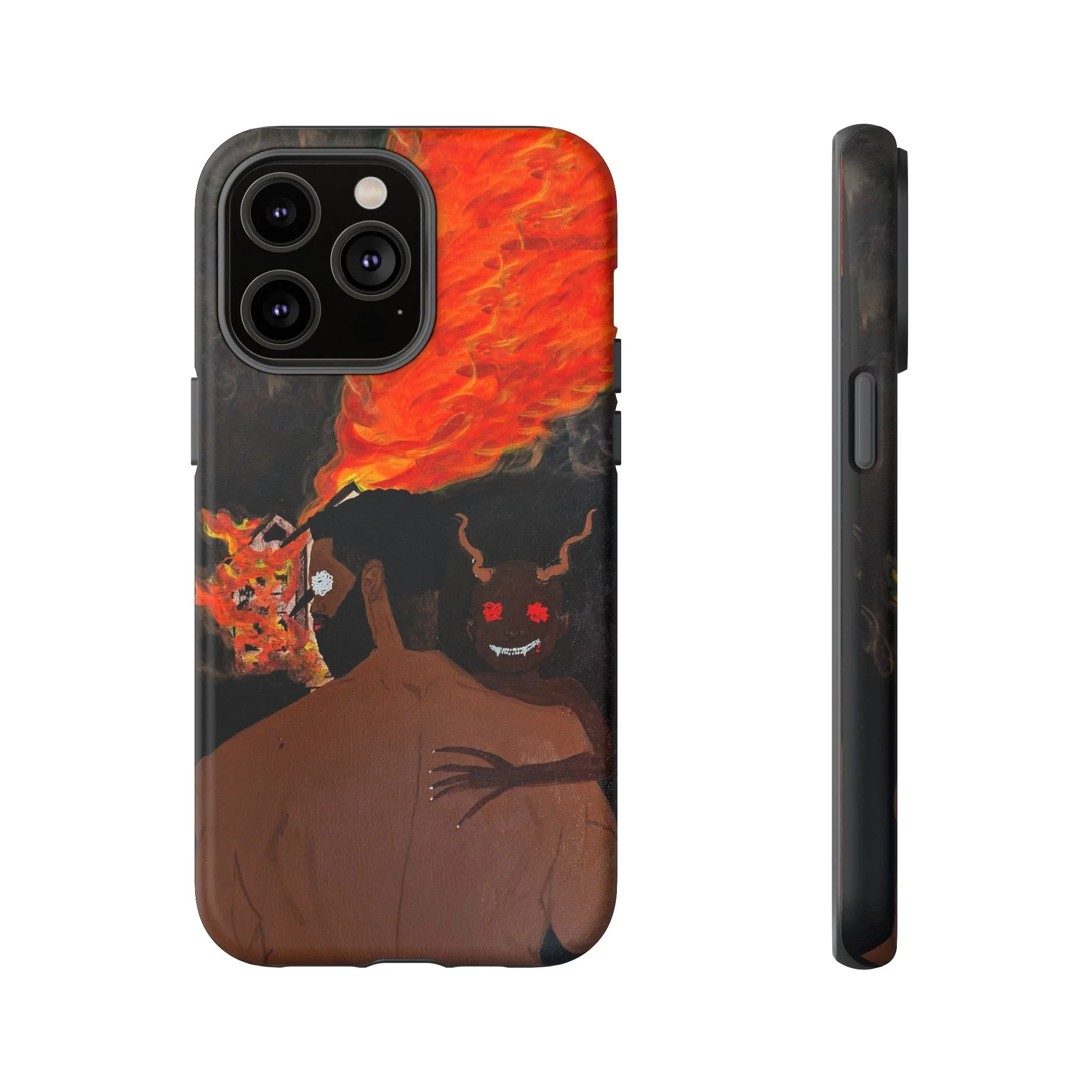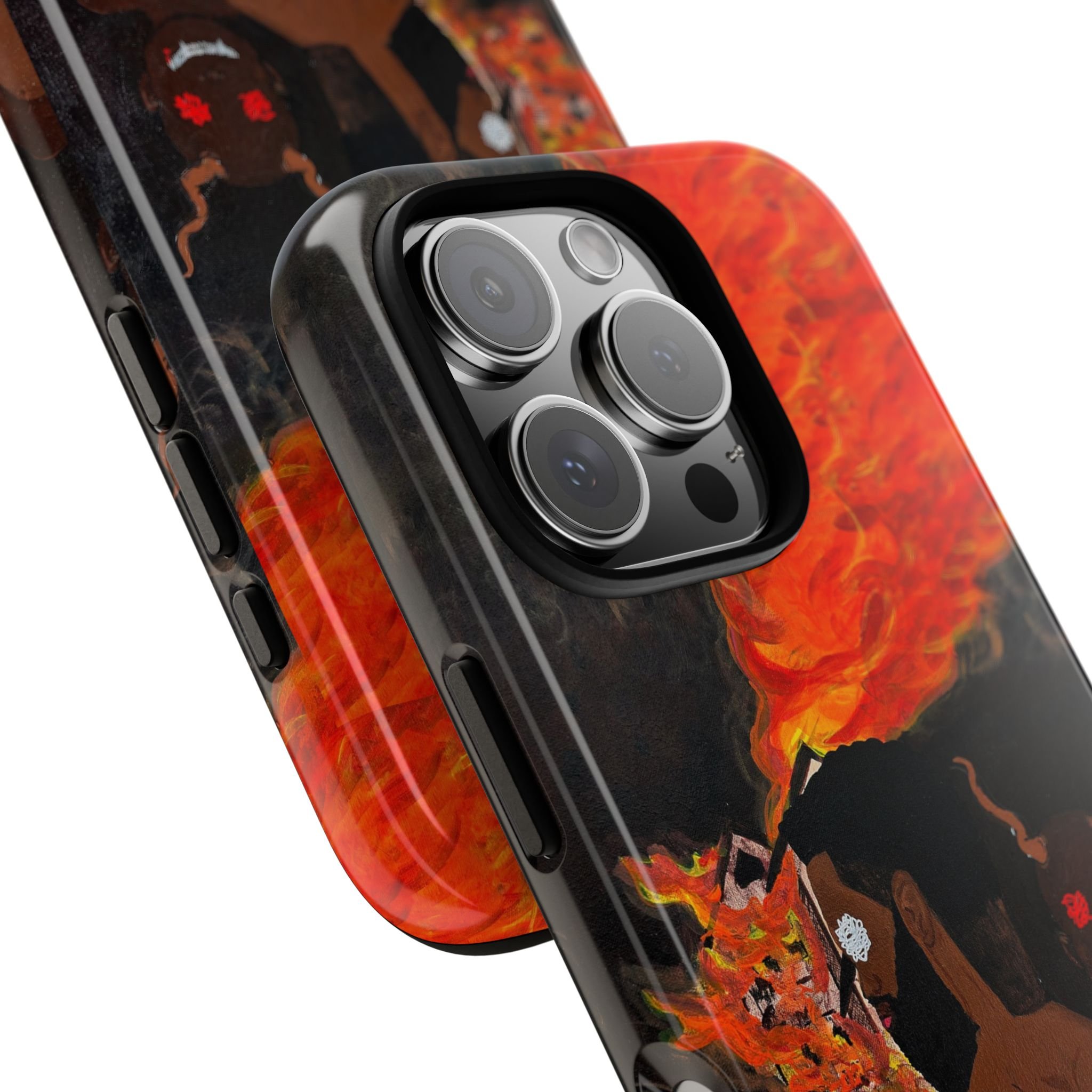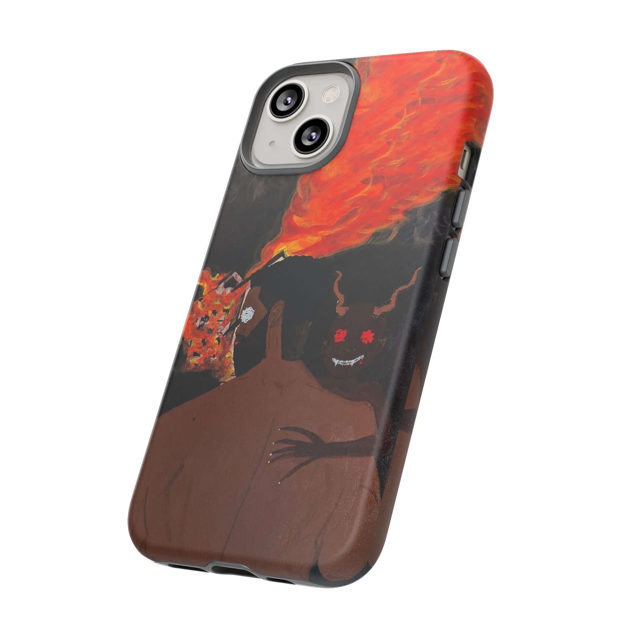 This tough phone case carries attitude — a dark, hand-painted scene with flickering flames and a shadowy figure that feels part myth, part urban legend. The dual-layer shell and soft TPU liner work together to absorb shocks and guard your device while the full-wrap print keeps the artwork vivid across the edges. It wears well on daily commutes and late-night walks, adding a raw, expressive edge to a pocket or bag. Built to handle drops and everyday knocks, it also resists outdoor fading thanks to UV protection. Keep it dry and away from heavy alcohol-based products to preserve the finish, and you'll have striking protection that keeps its story intact.