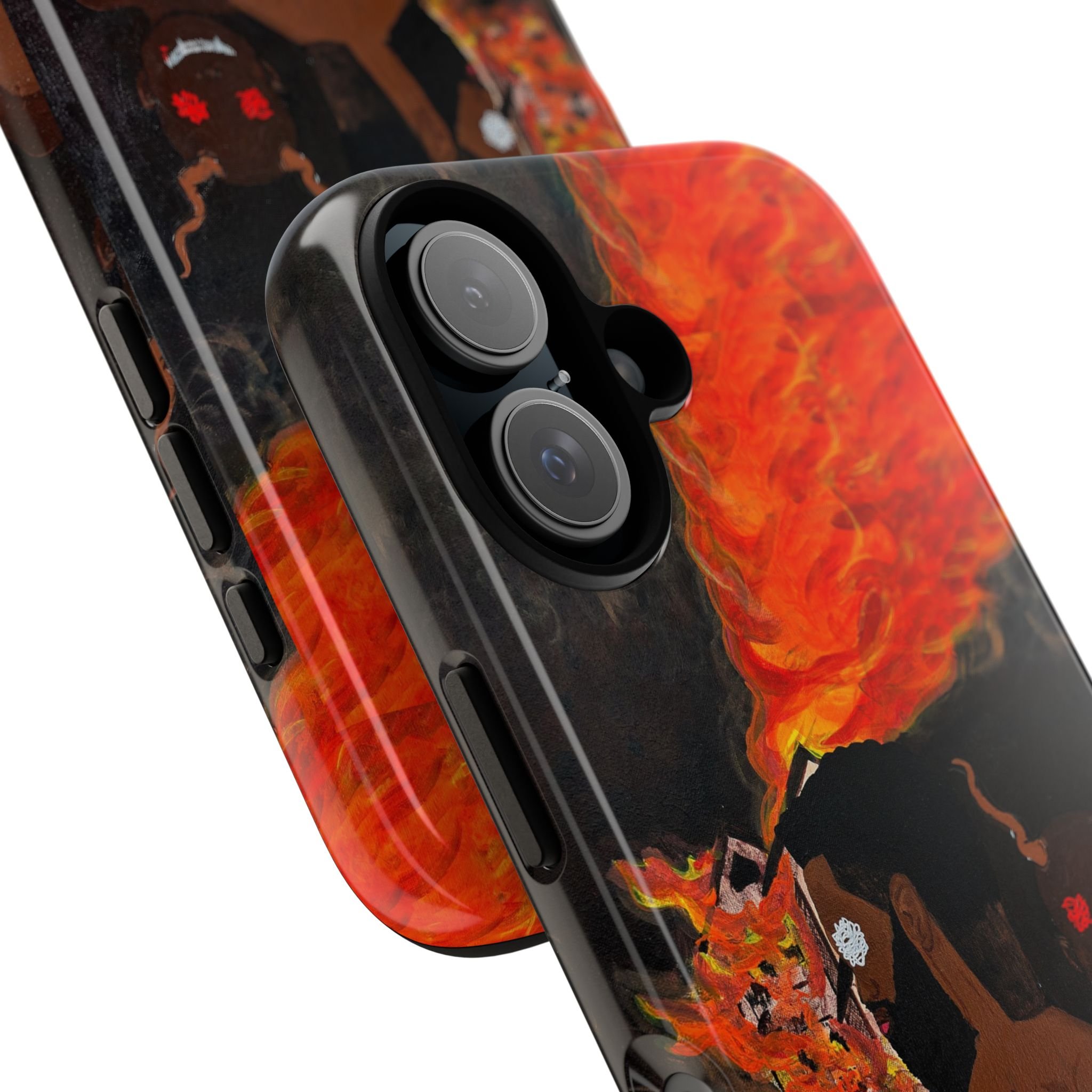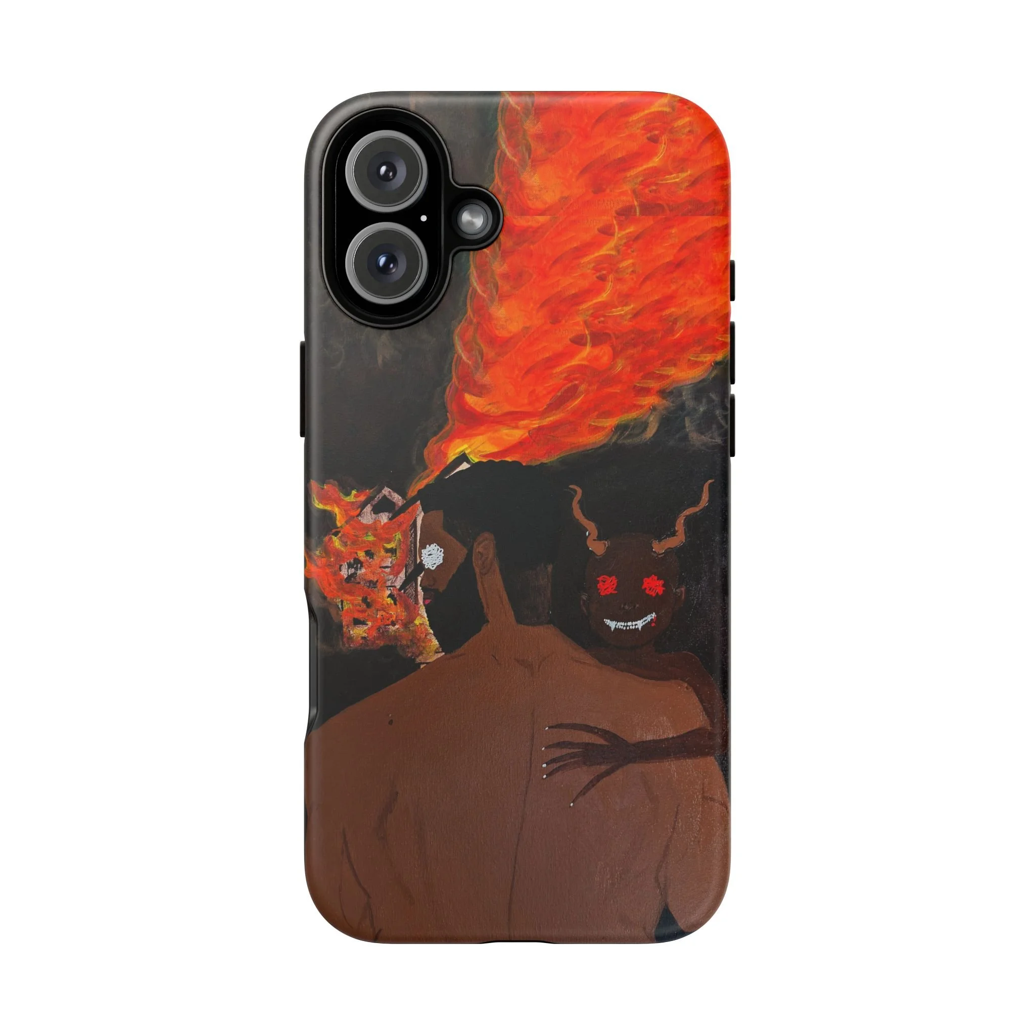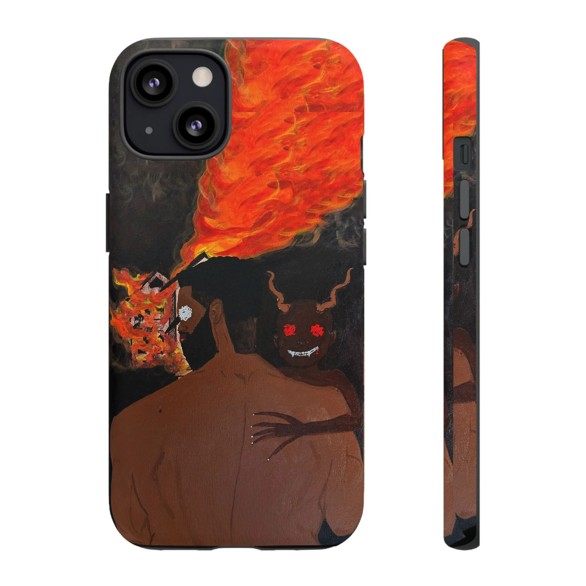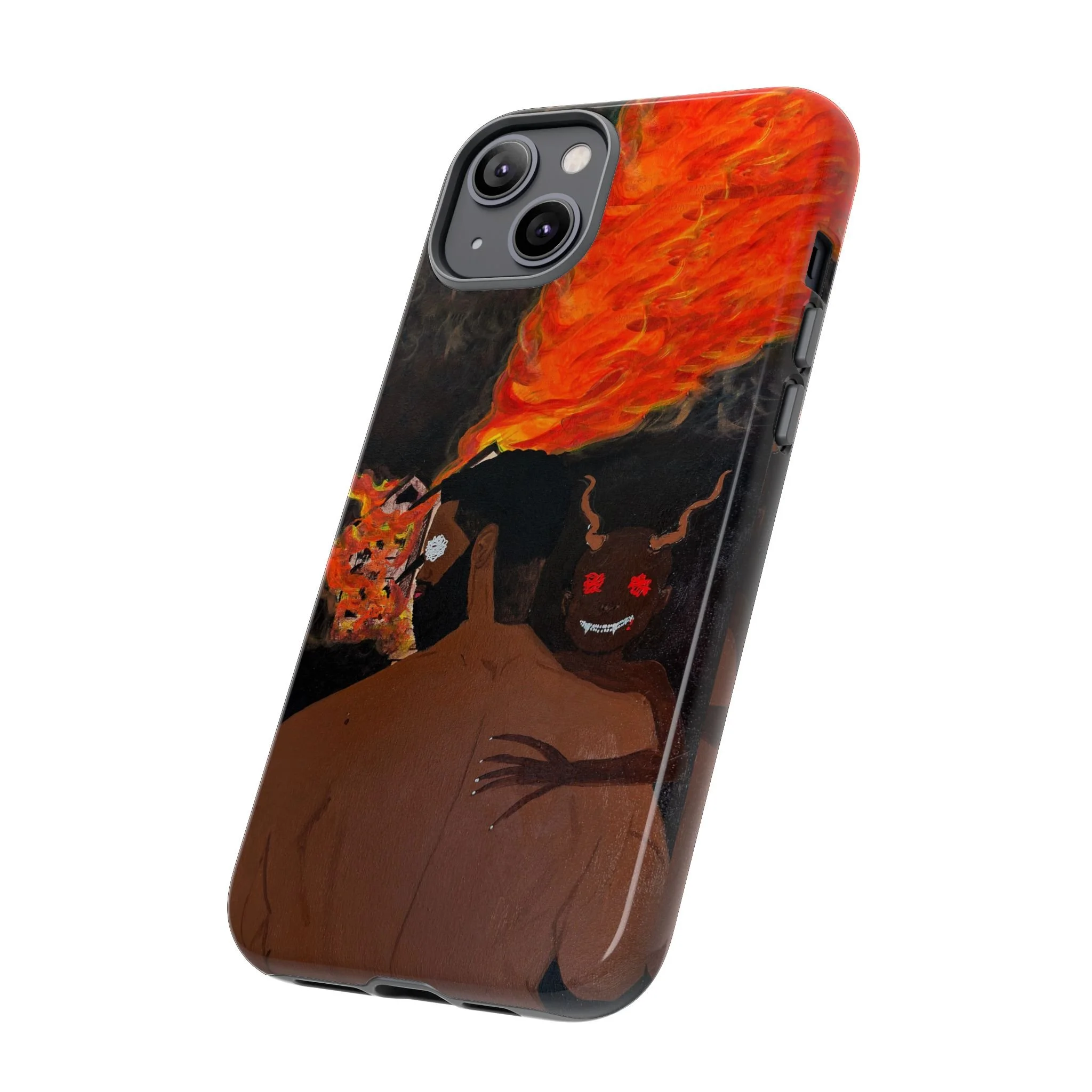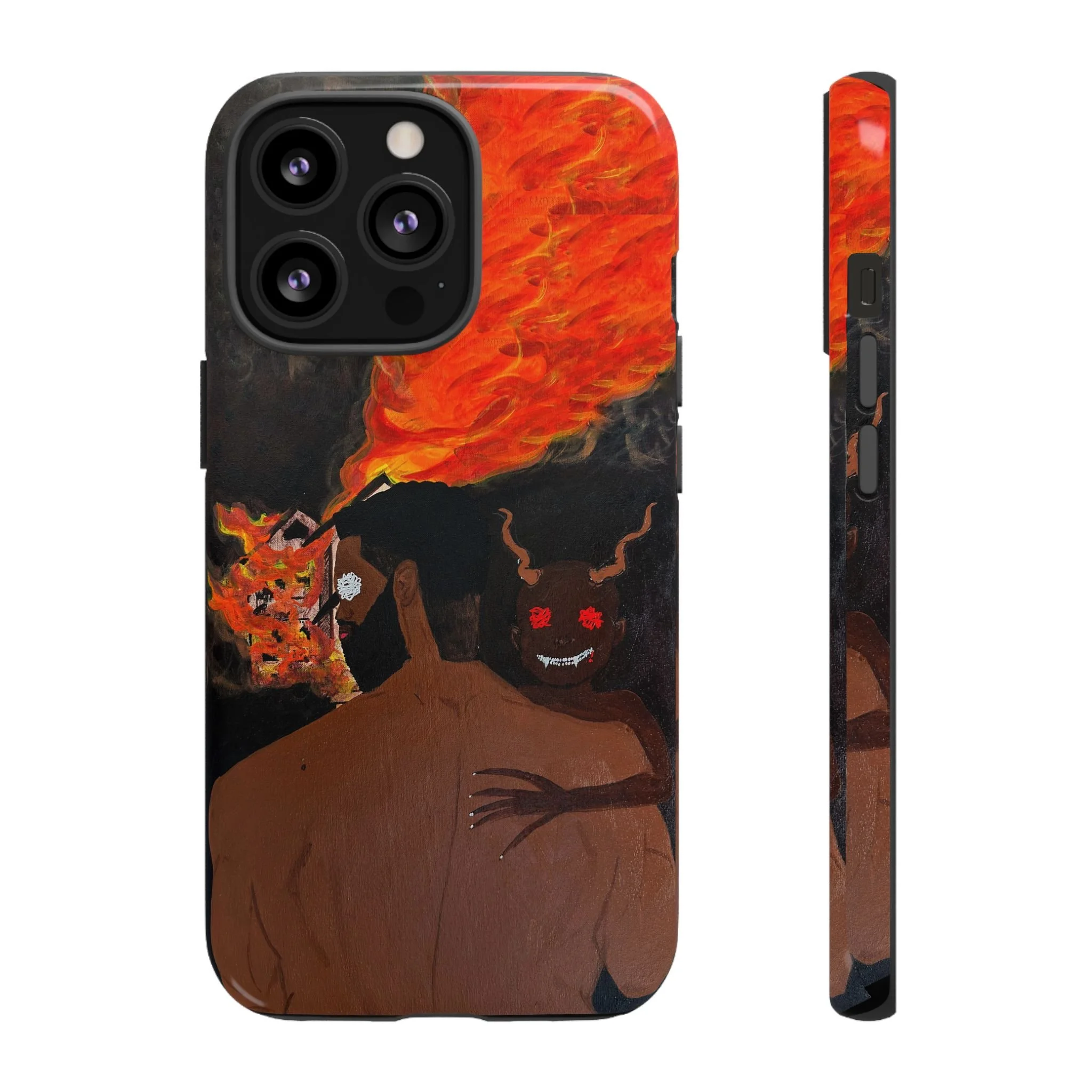 This tough phone case carries attitude — a dark, hand-painted scene with flickering flames and a shadowy figure that feels part myth, part urban legend. The dual-layer shell and soft TPU liner work together to absorb shocks and guard your device while the full-wrap print keeps the artwork vivid across the edges. It wears well on daily commutes and late-night walks, adding a raw, expressive edge to a pocket or bag. Built to handle drops and everyday knocks, it also resists outdoor fading thanks to UV protection. Keep it dry and away from heavy alcohol-based products to preserve the finish, and you'll have striking protection that keeps its story intact.